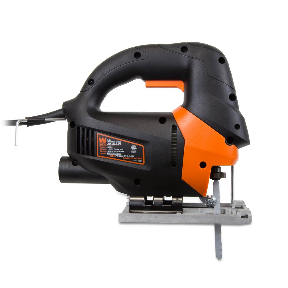 The WEN 6 Amp Variable Speed Orbital Jig Saw glides through wood, metal, plastic and more, making any pattern or contour easy to achieve. The variable speed dial adjusts the stroke of the blade anywhere from 800 to 3,000 SPM. Attack wood up to 4 in. thick and metals up to 3/8 of an in. The onboard support selection lever helps adjust the strength of the blade to match the density of the cutting material while the lightweight 5 lb. design limits fatigue during operation. Easily bevel the bottom footplate up to 45° in either direction for angled cuts in your work piece. The lock-on button temporarily holds the trigger in place to alleviate the stress of keeping the trigger engaged during long jobs. Make blade changes and installation faster than ever with the tool-free quick release chuck. The onboard tool storage system ensures that any necessary hex wrenches are always close while the rear-mounted dust port allows for attachment to the dust collection device of your choice. And, because it’s a WEN Product, the WEN 6 Amp Variable Speed Orbital Jig Saw comes backed by a two-year warranty, a nationwide network of skilled service technicians and a friendly customer phone line all to make sure you remember WEN.