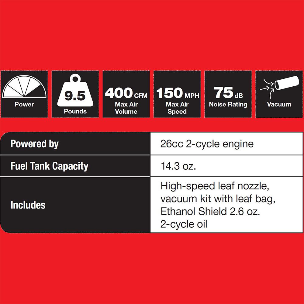 The Homelite 150 MPH 400 CFM Gas Blower/Vacuum is designed to provide you flexible operation to help you accomplish various tasks around your yard. This product features a variable speed throttle with cruise control that can clear debris from your yard to your landscape beds. The interchangeable blower tubes and mulching or vacuum capabilities make this a versatile blower that can perform many different tasks in your yard. This blower features an anti-vibration handle and lightweight design making it easy to carry during use, so you can finish the job.