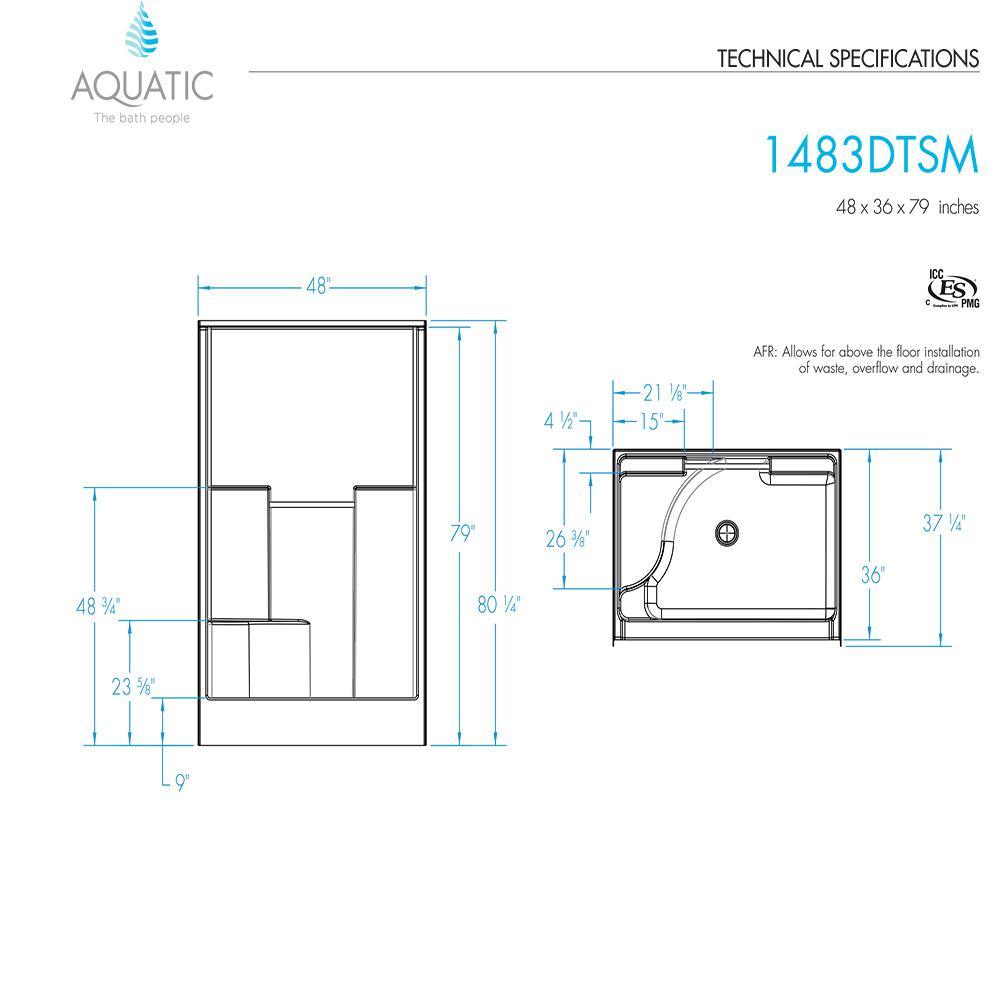 The versatility of our shower selection is simply inspiring, with a wide variety of sizes available, from 32 in. to 60 in. When it comes to style, you'll find an array of tile-pattern and smooth wall finishes to choose from. This unit is crafted from an Acrylx applied -Acrylic finish reinforced with Armorcore. Our Everyday line of product now comes standard with Aquatic's exclusive ArmorCore bottom reinforcement; our newest manufacturing breakthrough. This unit has two integral shelves, Right hand molded seat and a center drain. This unit features a decorative diagonal tile design. This unit is the AFR version; accommodates above the floor installation of plumbing.