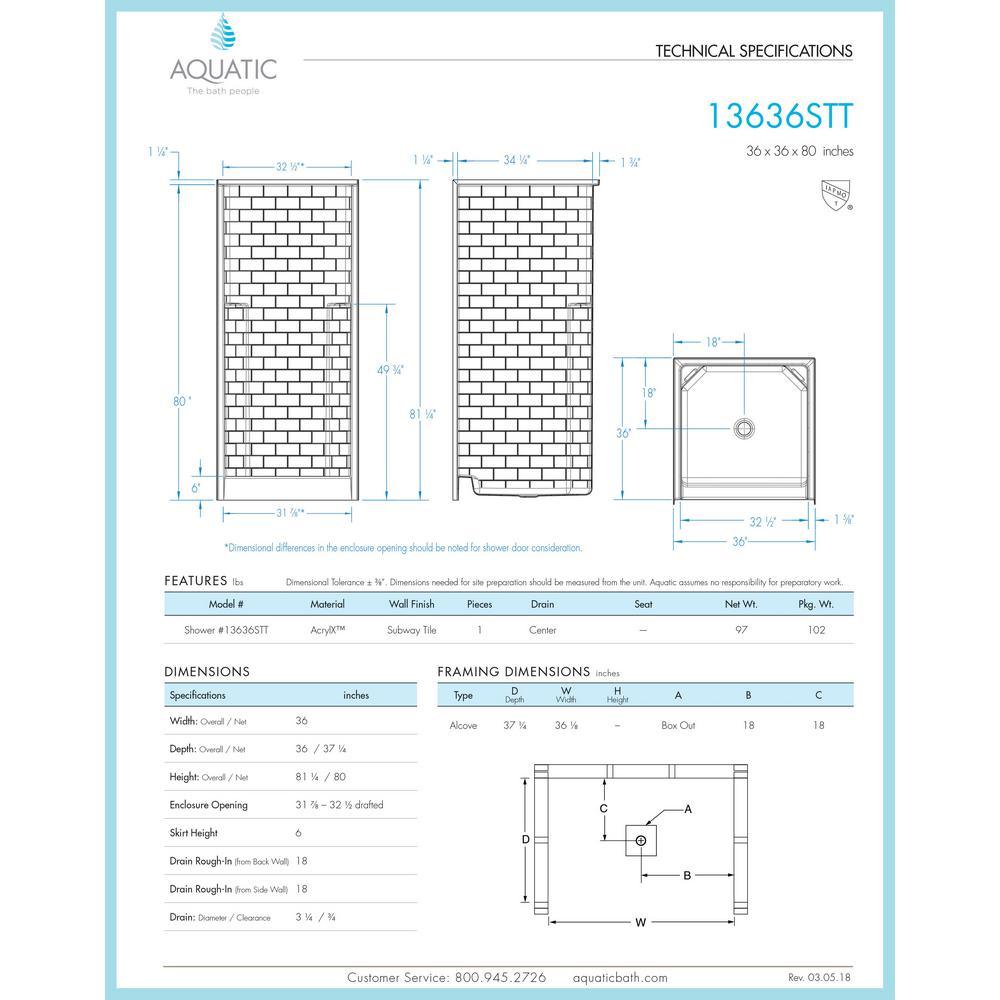 The versatility of our shower selection is simply inspiring, with a wide variety of sizes available, from 32 in. to 60 in. When it comes to style, you'll find an array of tile-pattern and smooth wall finishes to choose from. This unit is crafted from an Acrylx applied -Acrylic finish reinforced with Armorcore. Our Everyday line of product now comes standard with Aquatic's exclusive ArmorCore bottom reinforcement; our newest manufacturing breakthrough. This unit has two integral shelves and a center drain. This unit features a Subway tile design that is both timeless; goes with both modern and traditional decor.