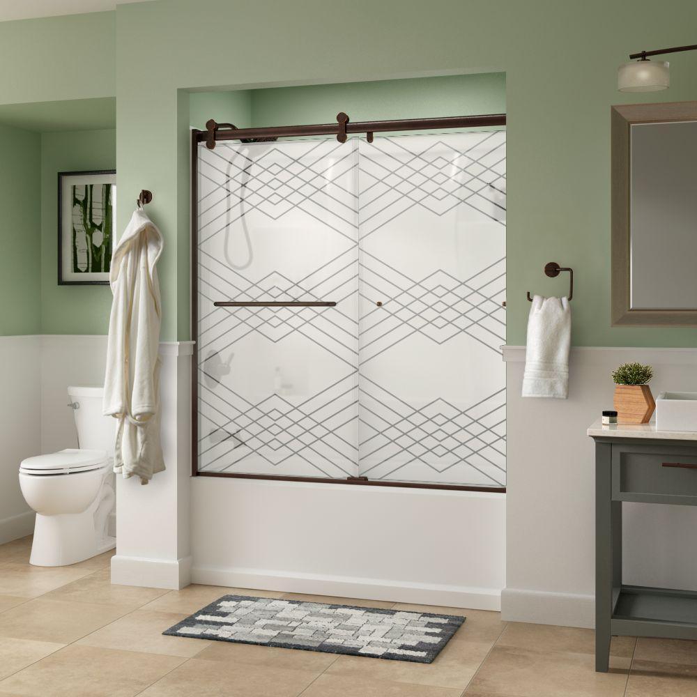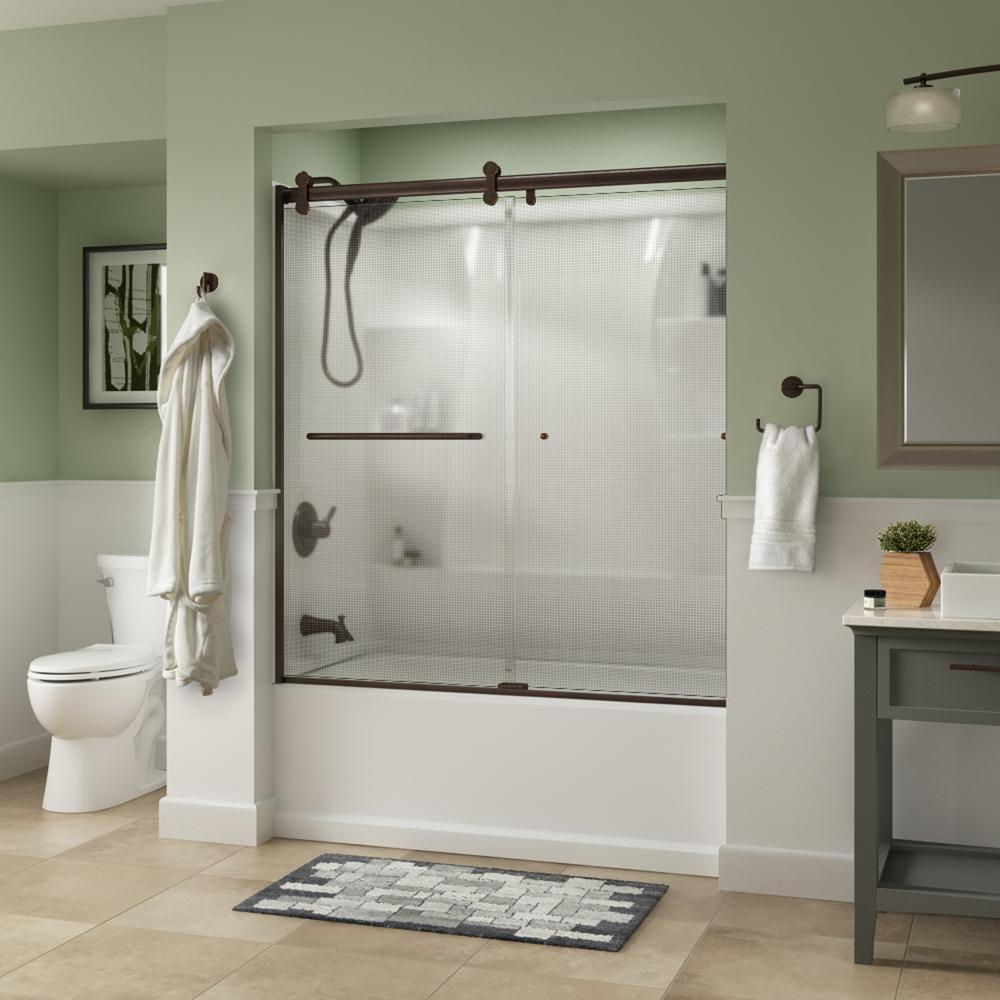 Whether you’re looking for a moderate DIY project or working on a bathroom remodel, upgrading your bathroom with a new sliding shower door is easy with the Delta 1-2-3 custom sliding shower door program. Delta’s custom glass shower door program offers 1000s of design combinations by choosing your glass shower panels, shower door track, and shower door handles to build a unique, personalized glass shower door. Inspired by the trendy barn door style, the Contemporary bathtub door track in bronze is sleek and modern with exposed rollers for the perfect balance of industrial and contemporary design. Make a statement with standard 1/4 in. ANSI certified tempered glass shower panels, featuring an asymmetrical modern pattern of clear and small, frosted squares, creating a intricate pattern that adds randomized privacy. The Simplicity sliding shower door handle with knobs features a convenient towel bar for extra bathroom storage and two interior knobs for extra showering space in a simple design silhouette that beautifully combines form and function.