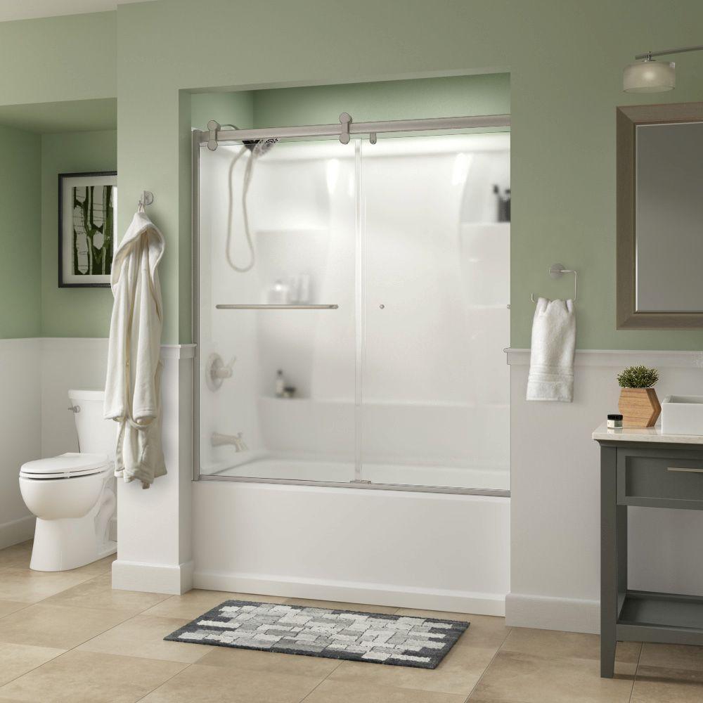 • Contemporary sliding bathtub door designed to accommodate out-of-plumb (uneven, not vertically level) conditions totaling 3/8 in.