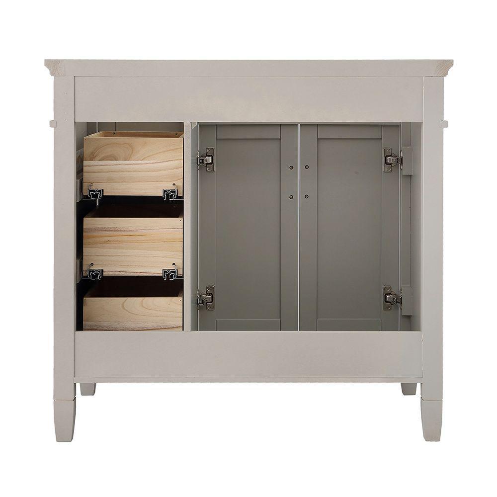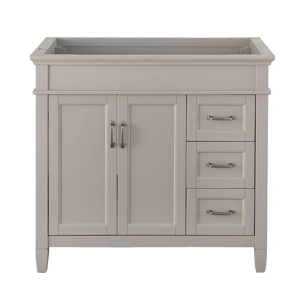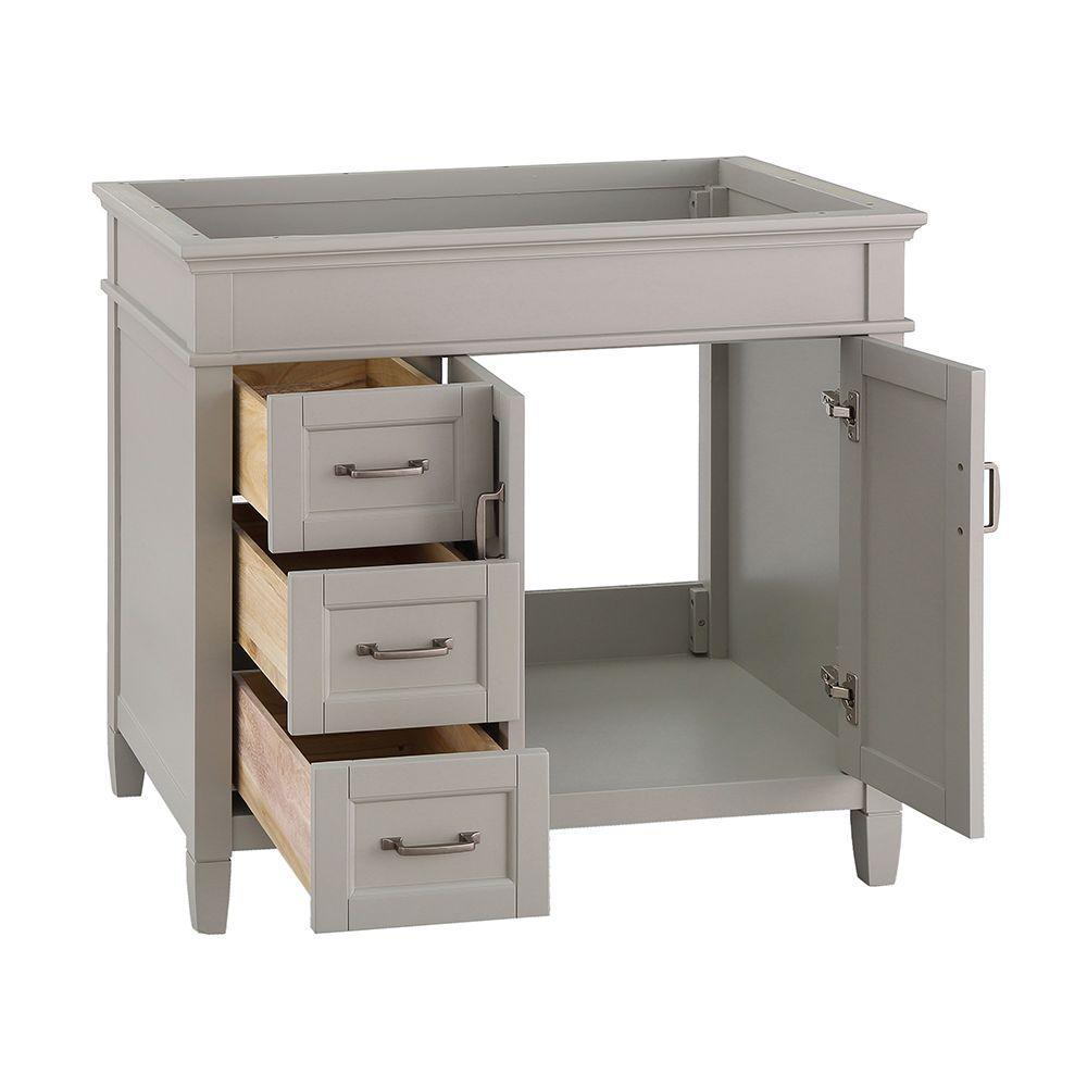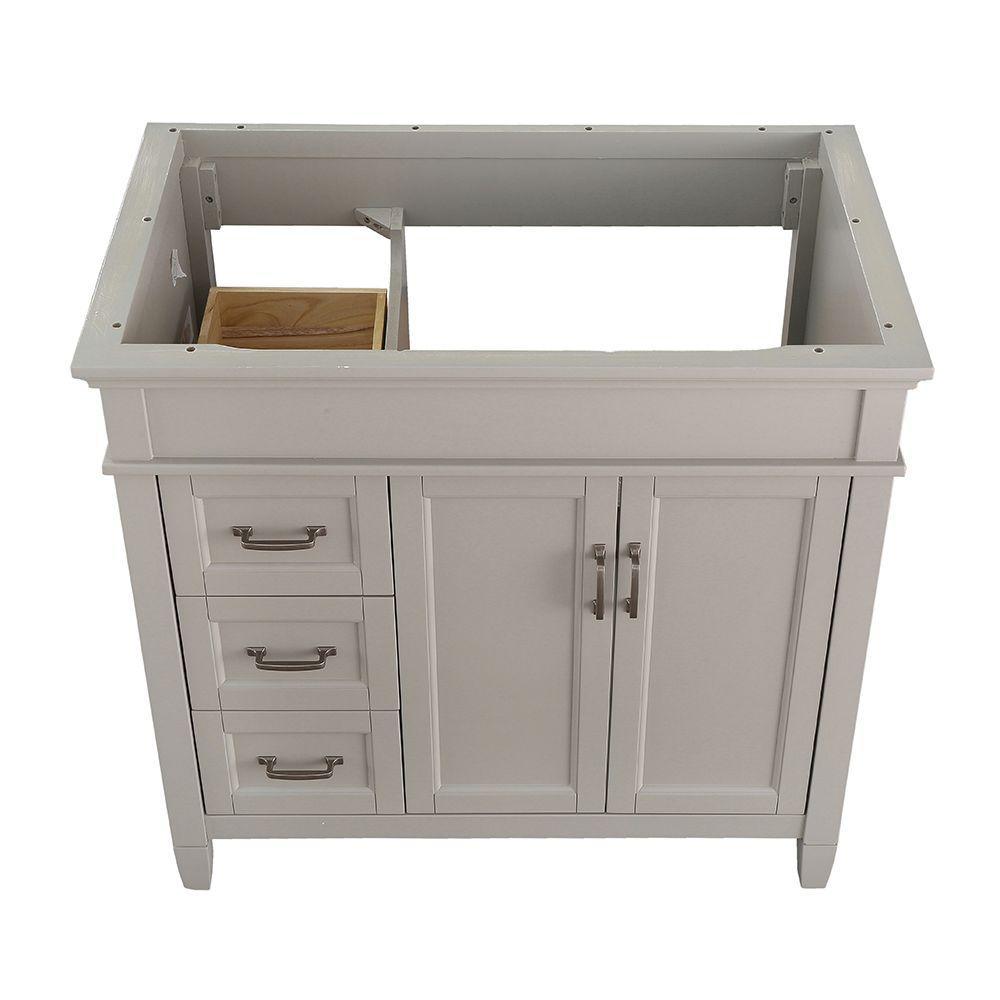 The Ashburn 36 in. bathroom vanity cabinet offers a design that is both decorative and fully functional to complement your decor. This upscale vanity boasts an understated grey finish and a clean, sleek profile for a modern look. Two cabinet doors with soft-stop bumpers and three left-side drawers offer a bevy of storage options for linens and bath essentials, setting the tone for a tidy powder room. The sturdiness and craftsmanship of this vanity cabinet offers a custom look, while small details like leg levelers instill confidence for perfectly stable setups. Pair this vanity cabinet with other items from the Foremost Ashburn collection for a complete bathroom makeover.