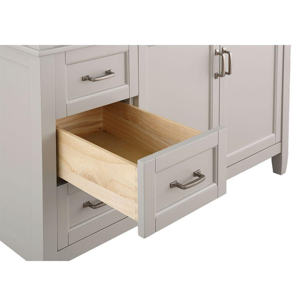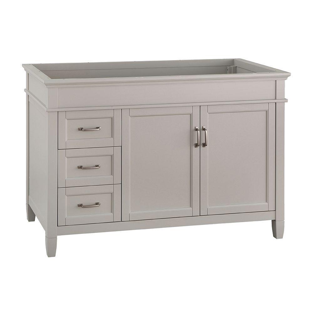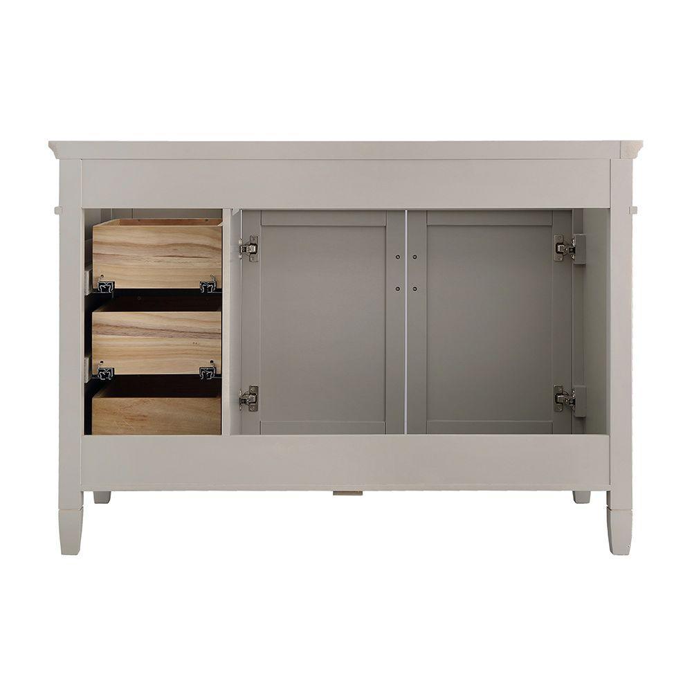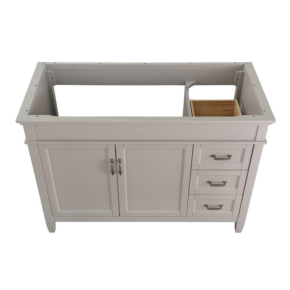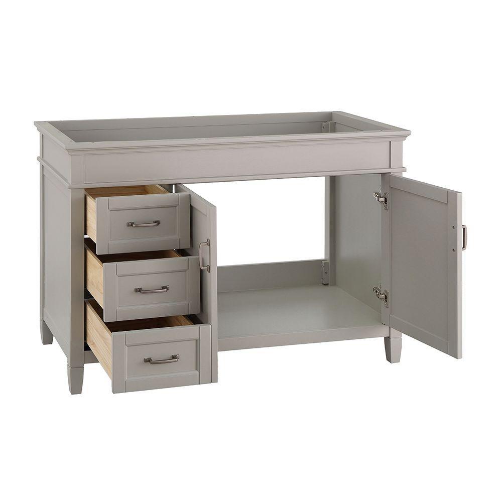 Enrich your bathroom ambience with this upscale 48 in. vanity that is more affordable than it looks. With an understated Grey finish and a clean, sleek profile, this modern piece has an understated elegance that will impress homeowners and guests alike. Two large cabinet doors with soft-stop bumpers and three left-side drawers open up a bevy of storage options for linens and bath essentials, setting the tone for a tidy powder room. The sturdiness and craftsmanship of this vanity cabinet will make you think it is custom-built, while small details like leg levelers instill confidence for perfectly stable setups. Gaze through the Foremost Ashburn collection for complementary Grey items like wall cabinets and mirrors for a complete bathroom makeover.