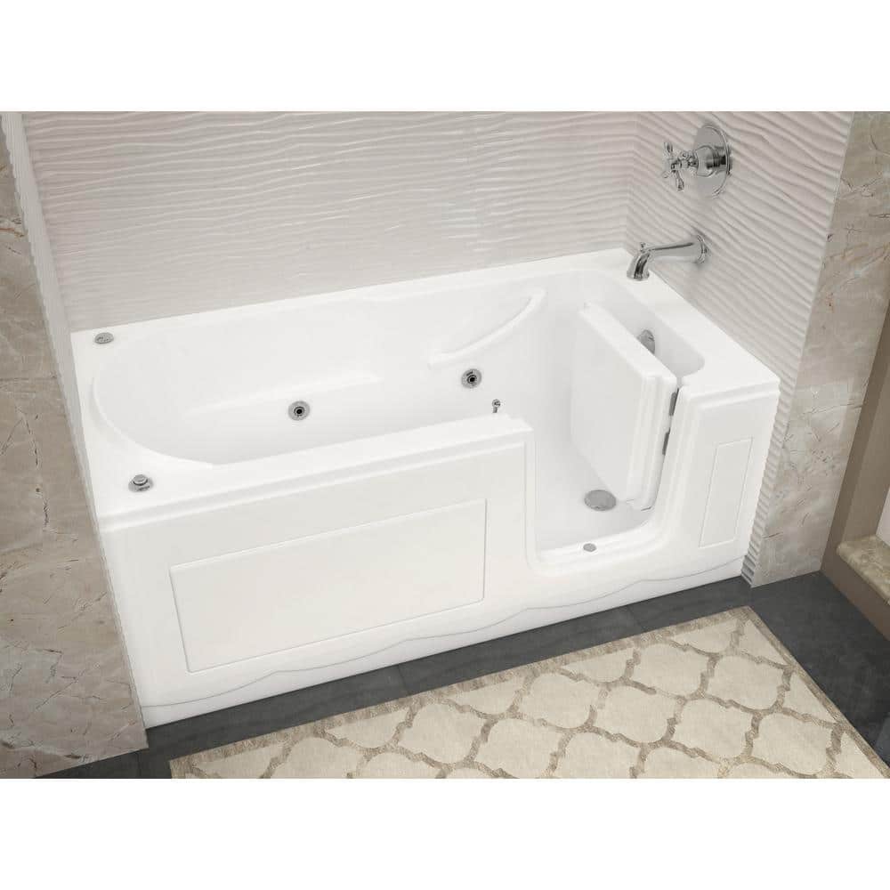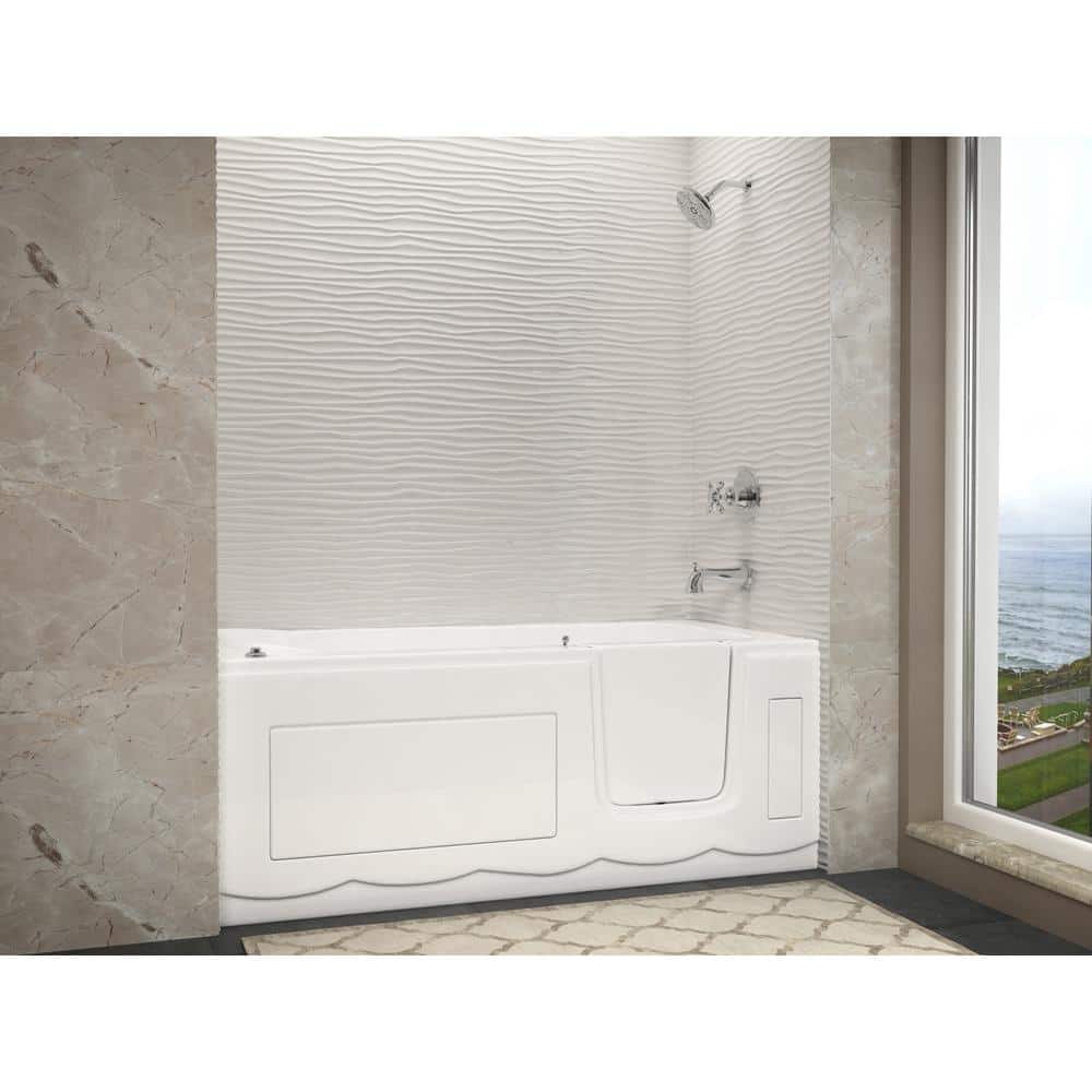A 5-ft walk-in whirlpool tub designed for safe, independent bathing with a heated backrest and low-threshold entry. Acrylic construction over marine-grade fiberglass, stainless steel frame, and right-hand drain deliver durability and easy alcove installation.