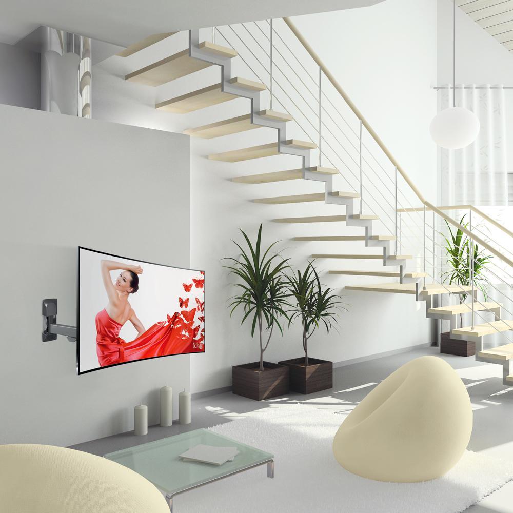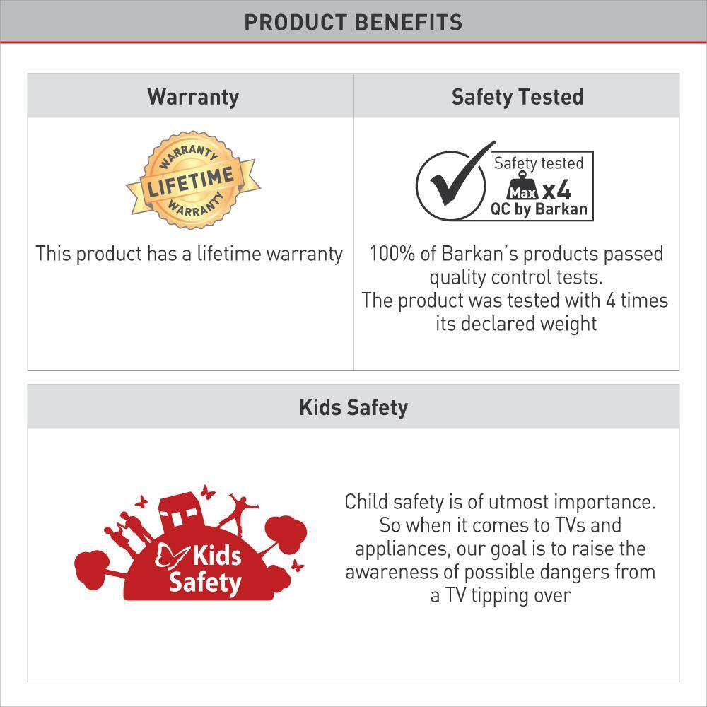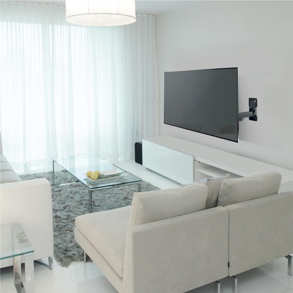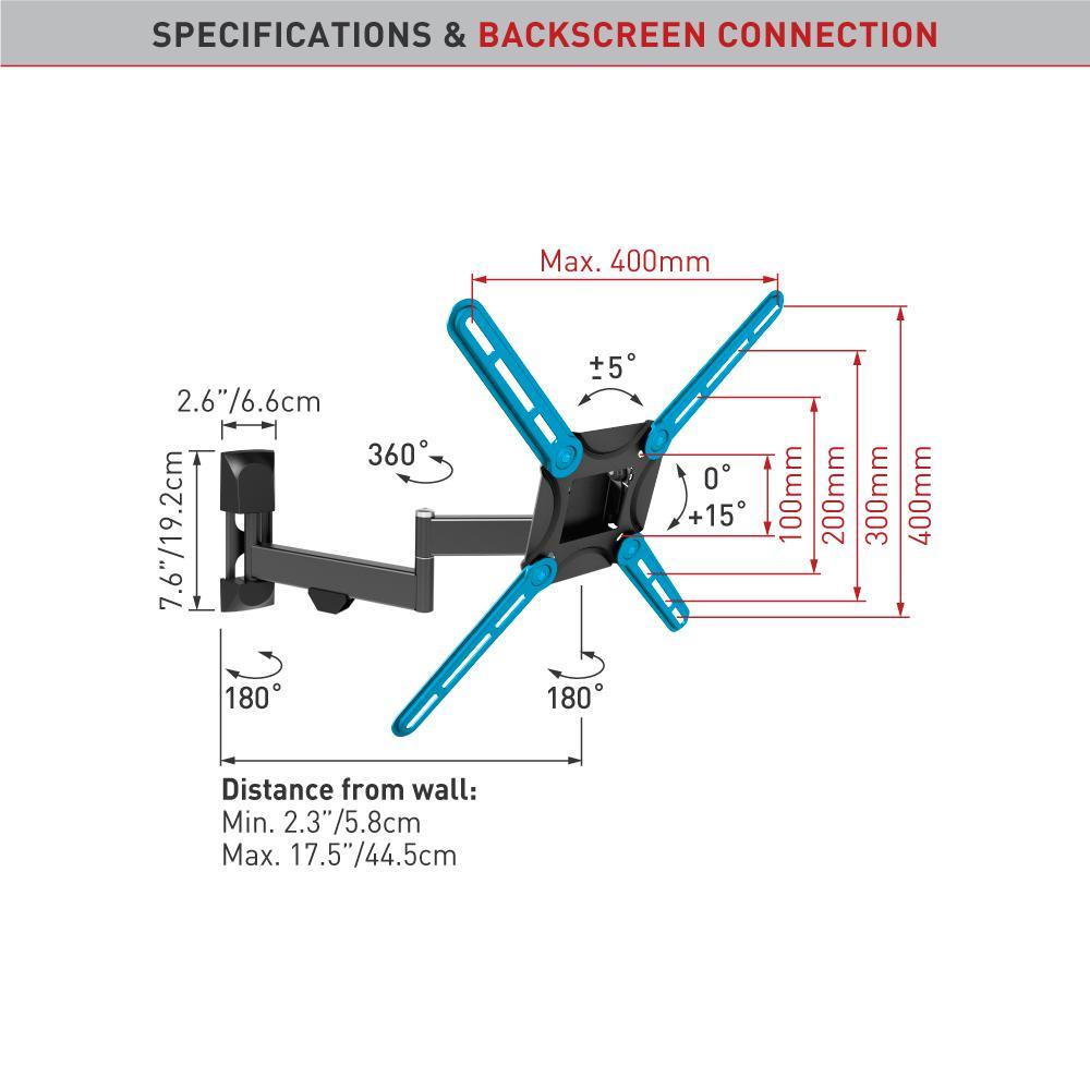 The Barkan full motion, four - movement TV mount with rotate, fold, swivel and tilt options fits flat / curved screens sizes 29 - 56 inches and weight up to 55 lbs. The minimum distance between the mount and the wall is only 2.3 in. and the maximum distance is 17.5 in. It fits TVs with VESA standard (Bracket Mounting Holes Patterns) 100x100, 100x200, 200x100, 200x200, 300x300, 200x400, 300x400, 400x300, 400x400 mm and non VESA up to 400x400 mm. In order to offer a better point of view, the mount has three pivots: near the wall 180 degrees, foldable 360 degrees, swivel near the screen connection plate 180 degrees and also tool free tilt from 0 till 15 degrees. The mount has a lifetime warranty and its color is Black. Please check the list of included screen-connection screws in the assembly instructions. If your screen requires different screen-connection screws, please purchase them in your local hardware store or consult us at sales.usa@barkanmounts.com. **If you are satisfied with the product, please leave a review. If you are not satisfied please contact us at https://www.barkanmounts.com/support and we will solve the problem for you**
