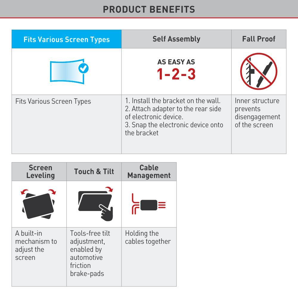 Self Assembly - 1. Attach adapter to the rear side of electronic device. 2. Install the bracket on the wall. 3. Snap the electronic device onto the bracket.