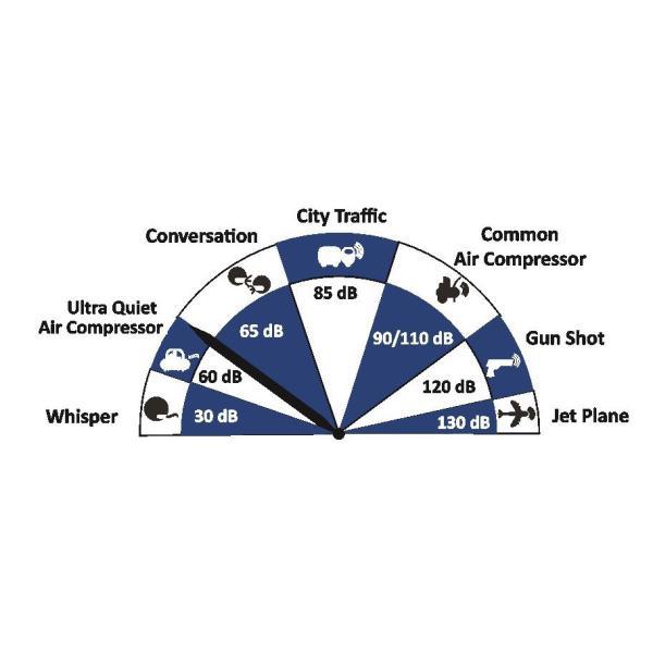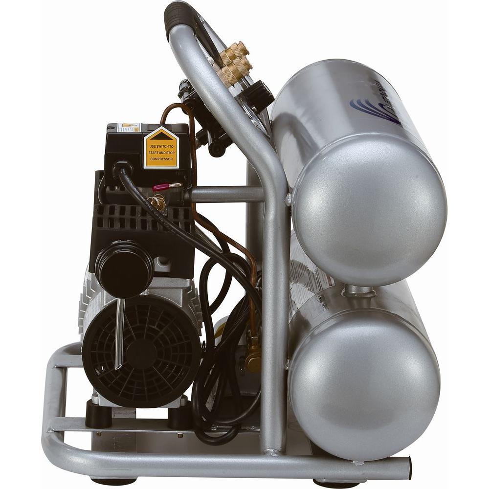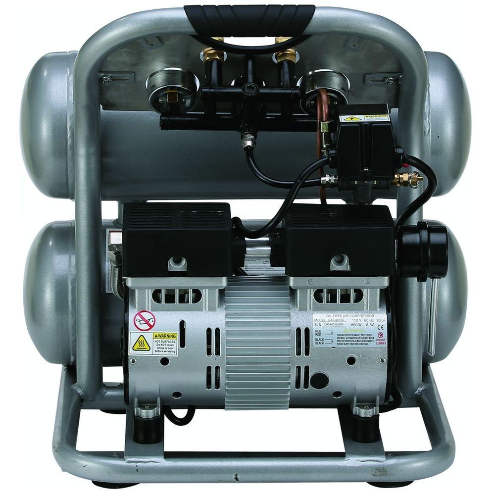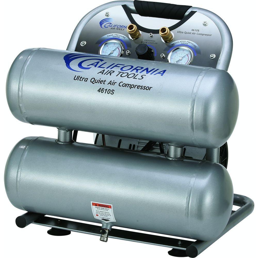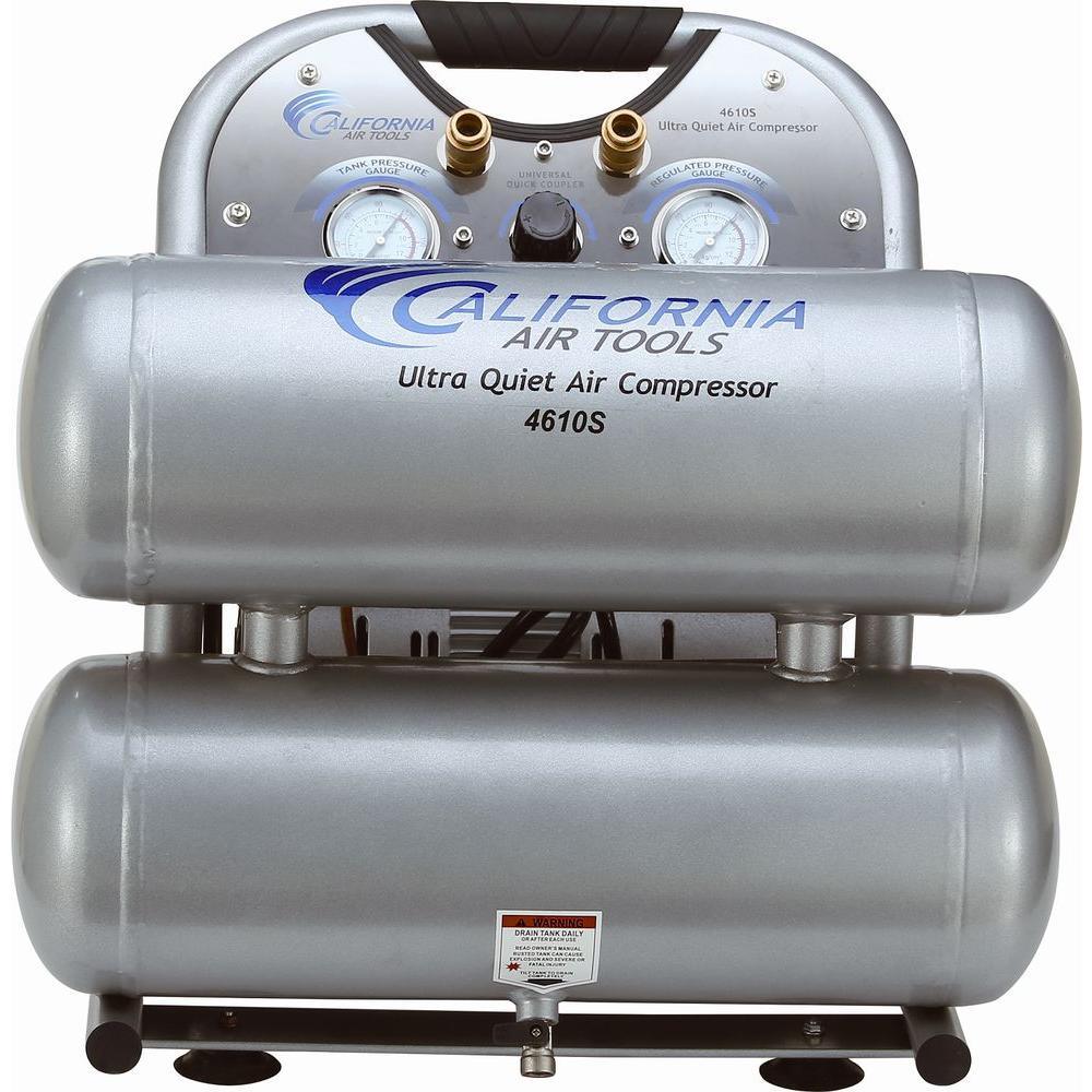 The California Air Tools 4610S Ultra Quiet and Oil-Free Air Compressor is designed to be one of the quietest air compressors in the industry having only 60 dB of sound. The powerful 1.0 HP (SP-9413) motor operates at only 1680 RPM creating less noise and less wear. The "New" SP Series of Ultra Quiet Air Compressor Motors have been designed to increase duty cycle and allow for longer continuous run times. The Oil-Free Dual Piston Pump System is engineered for high performance and durability. The CAT-4610S Air Compressor has an Oil-Free Dual Piston pump designed to have a life cycle before wear of 3000 Plus hours compared to other comparable air compressors with life cycles of 500 hours or less. The Oil-Free pump allows for use in a variety of temperatures and uneven terrains. The 4.6 Gal. Steel Air Tank is Lightweight (56 lbs.), durable and very easy to transport. This air compressor is ideal for anyone working inside where noise is a major issue.