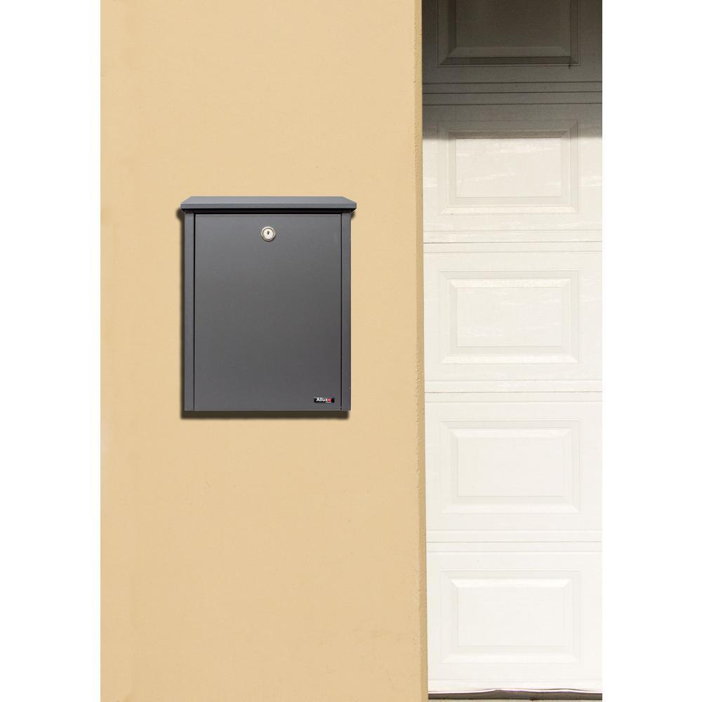 Allux 200 Wall mount mailbox is a rich and roomy, top-loading locking mailbox. A top lid covers the 9-7/8 in. x 1-1/2 in. slot. Steel construction with a durable powder coat finish.