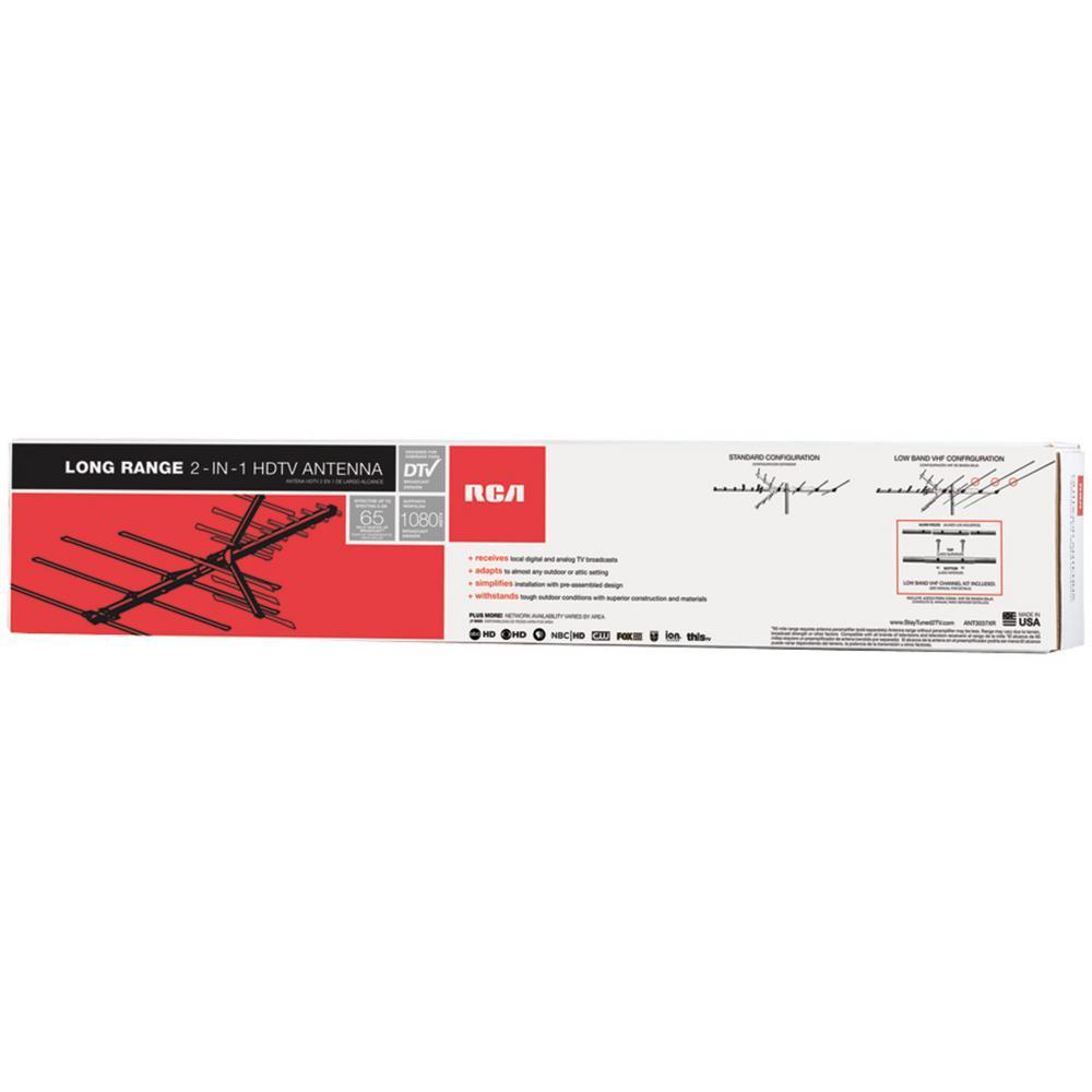 This long range 2 in 1 outdoor digital antenna is HDTV compatible with cross-phase multi-element design and a 66” length boom to boost UHF and VHF signals. Adapts to most outdoor or attic settings and withstands tough outdoor conditions. Includes locking mast clamp, mounting hardware and 75-ohm matching transformer.
