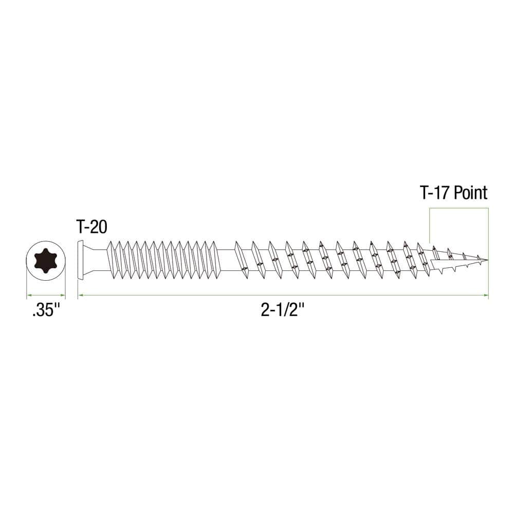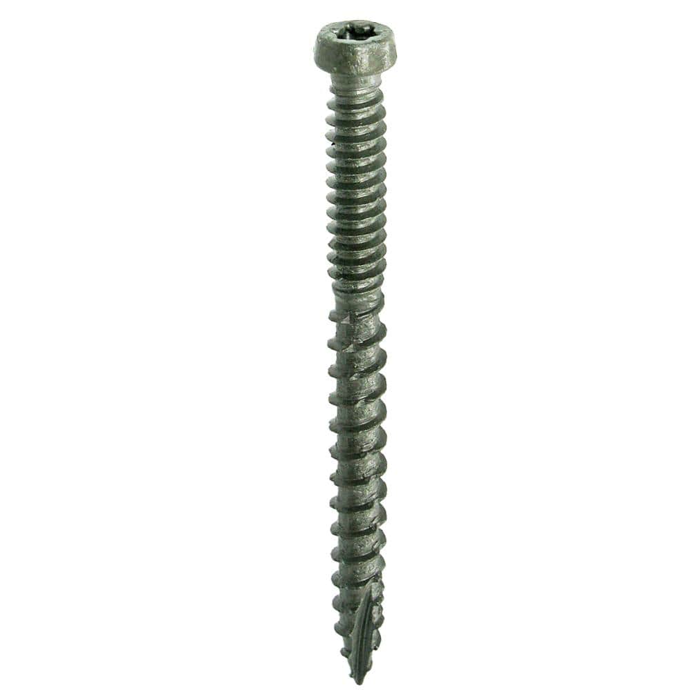 Composite deck screws designed for poly and PVC decking with a Torx/star drive for secure engagement. Durable carbon steel with a ceramic polymer coating resists corrosion outdoors. Dual-thread and Type-17 point help start fast and leave a smooth, mushroom-free finish.
