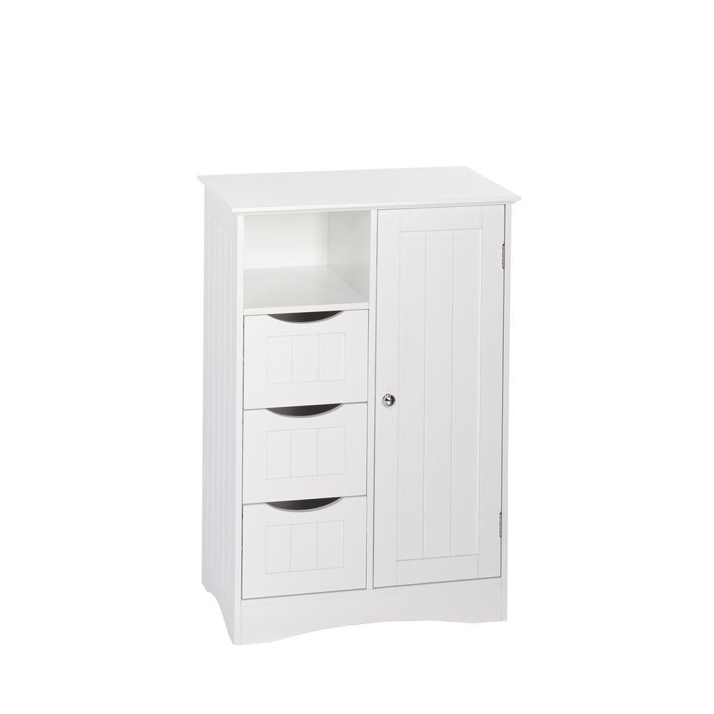 Expand storage capacity in the bathroom or in other rooms with this all-in-one storage cabinet from the RiverRidge Home Ashland Collection - 1 Door, 3 Drawer Floor Cabinet. Traditional design complements many styles of decor. Available in white and gray finish.