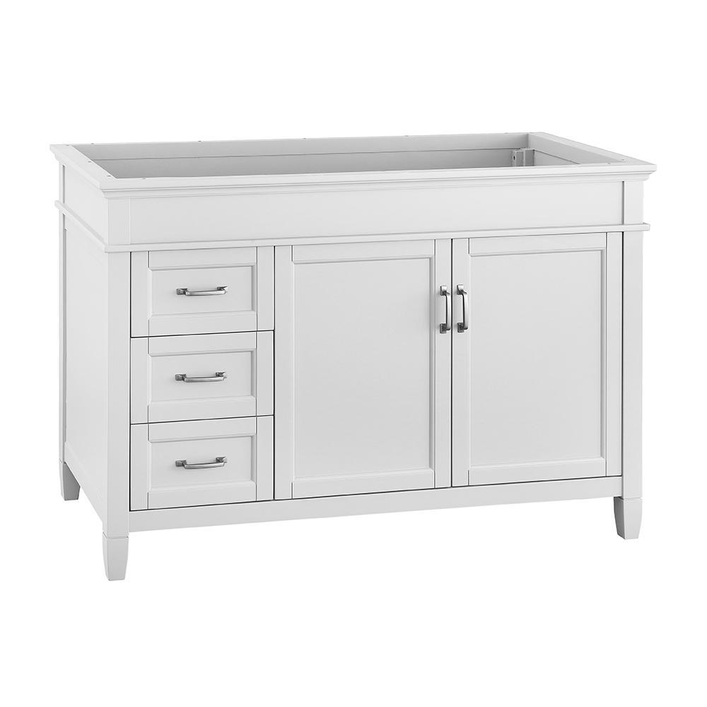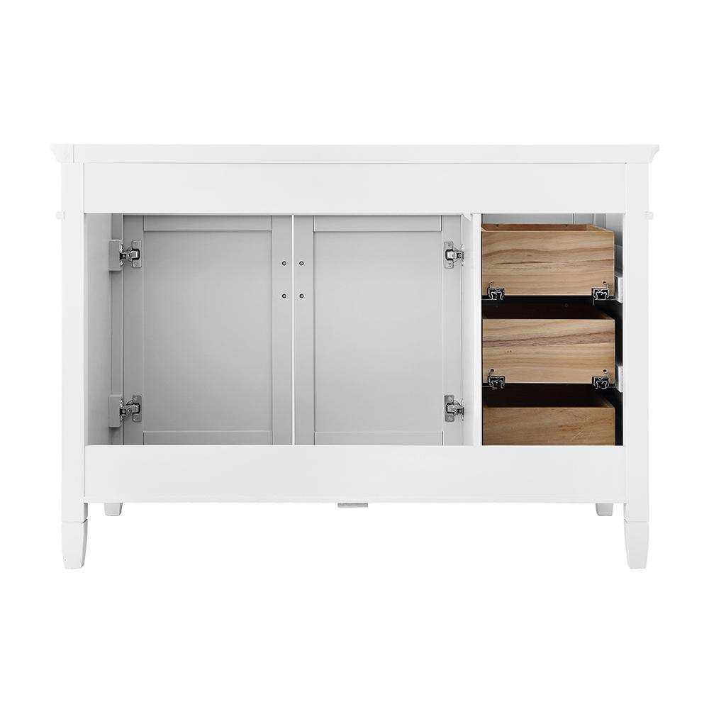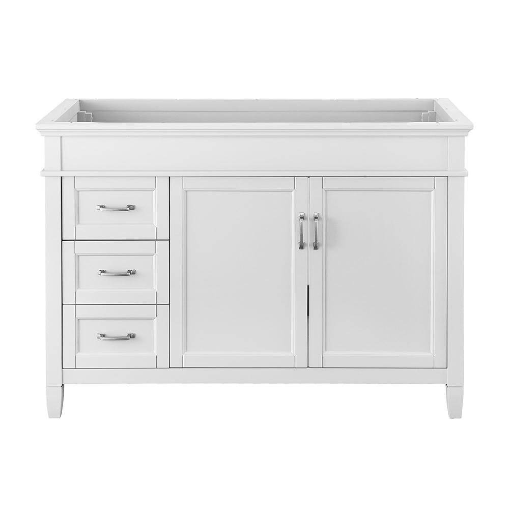 Enrich your bathroom ambience with this upscale 48 in. W vanity that is more affordable than it looks. With a classic white finish and a clean, sleek profile, this modern piece has an understated elegance that will impress homeowners and guests alike. Two large cabinet doors with soft-stop bumpers and three left-side drawers open up a bevy of storage options for linens and bath essentials, setting the tone for a tidy powder room. The sturdiness and craftsmanship of this vanity cabinet will make you think it is custom-built, while small details like leg levelers instill confidence for perfectly stable setups. Gaze through the Foremost Ashburn collection for complementary white items like wall cabinets and mirrors for a complete bathroom makeover.