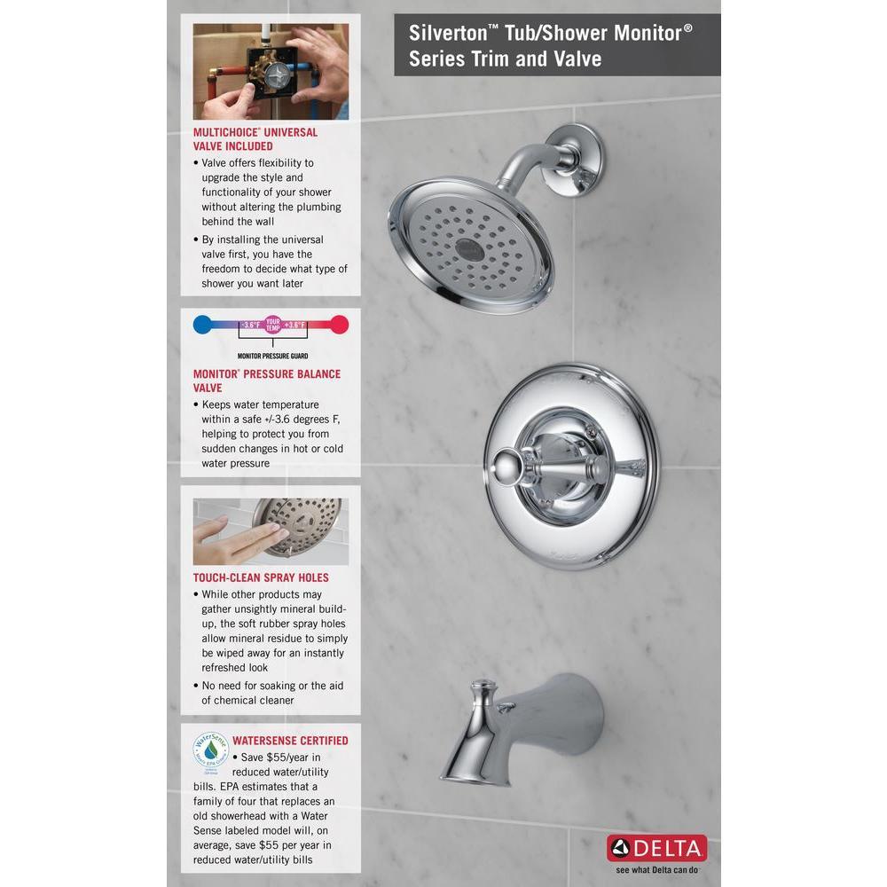 The graceful arc and classic detailing of the Silverton Single-Handle 1-Spray Tub and Shower Faucet from Delta offers a traditional yet timeless elegance. Its WaterSense certified design conserves water without diminishing your shower experience. A single lever handle makes it simple to control temperature with precision, while the finish offers easy-to-clean durability. You can buy with confidence, knowing Delta backs this Silverton faucet with a lifetime limited warranty.