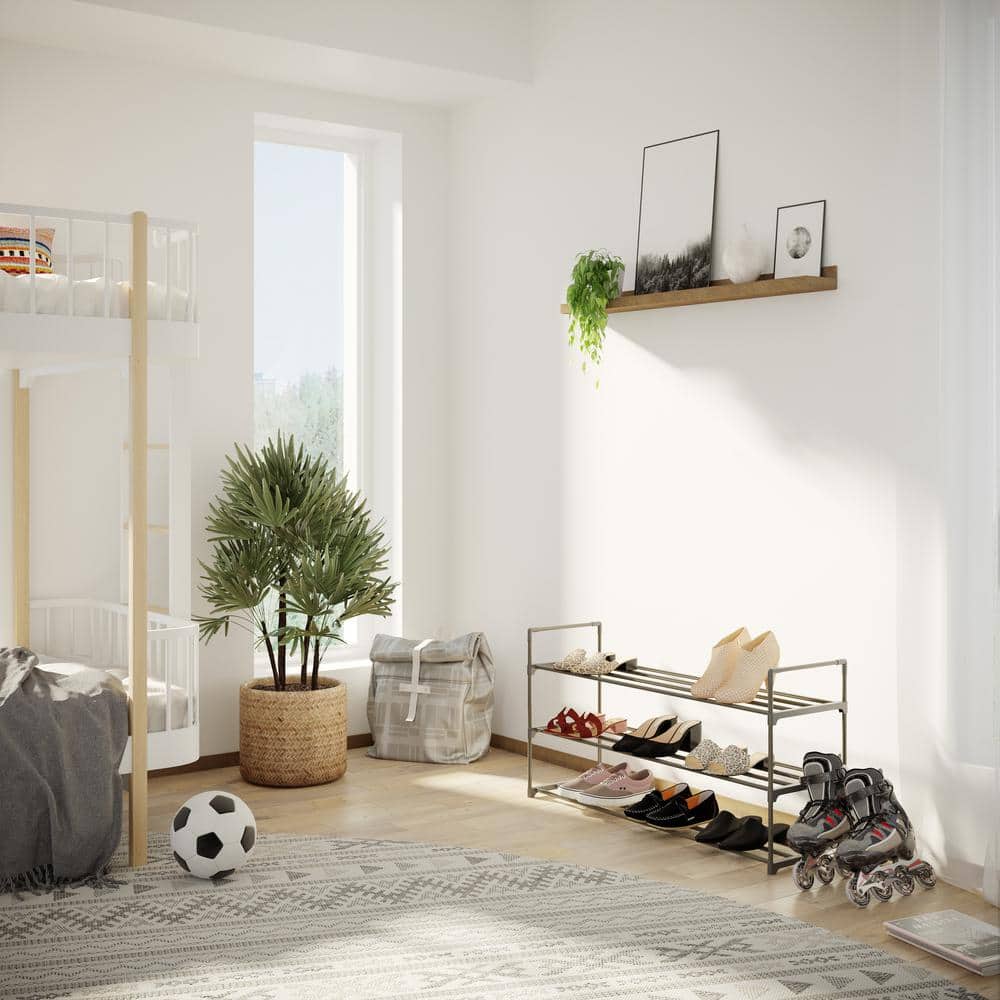 Envision transforming chaos into calm with this sleek, gray shoe rack that not only organizes but enhances your space with its minimalistic charm. Its slatted design offers a breath of fresh air to your shoe collection, while seamlessly integrating into your decor. Style it in an entryway with a vibrant rug beneath for a pop of color or against a serene wall as a functional focal point. This chic essential embodies the fusion of form and function, elevating your home to a realm of considered luxury.