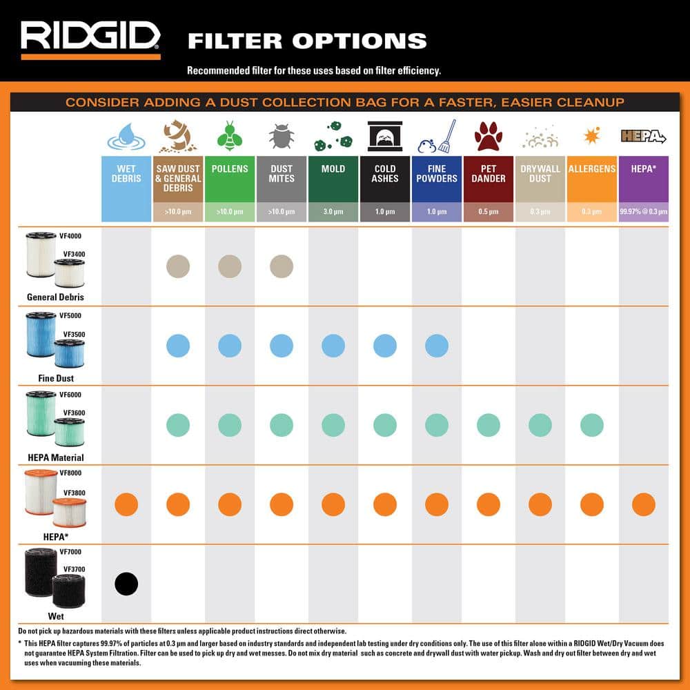 Q: What type of filter does it use? A: It comes with a general debris wet/dry vac filter and is compatible with additional RIDGID filters for specific cleaning needs.