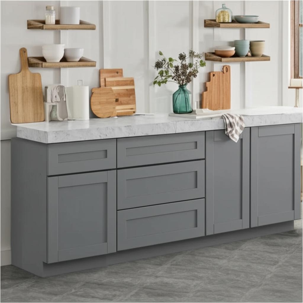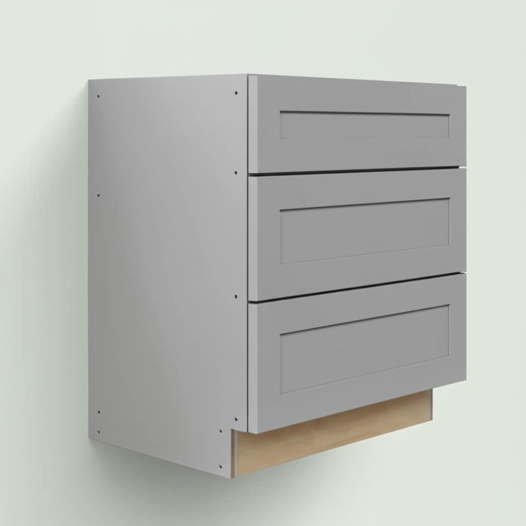 The Tremont Pearl Gray Drawer Base Kitchen Cabinet combines durable plywood construction with a stylish shaker design. Featuring soft-close drawers and a painted pearl gray finish, it offers both functionality and elegance for your kitchen.