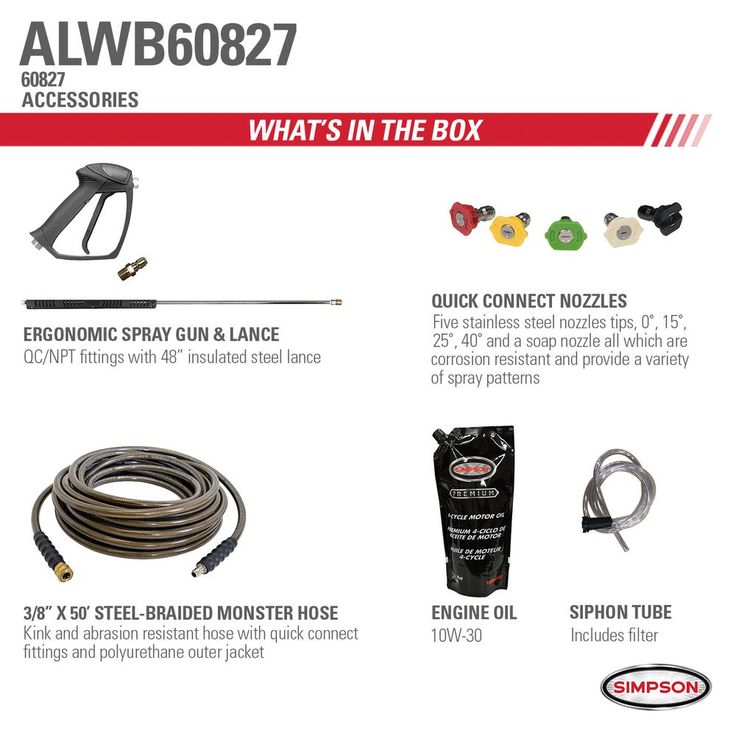 5 Quick connect nozzle tips: 0°, 15°, 25°, 40° and soap to use for a variety of cleaning applications