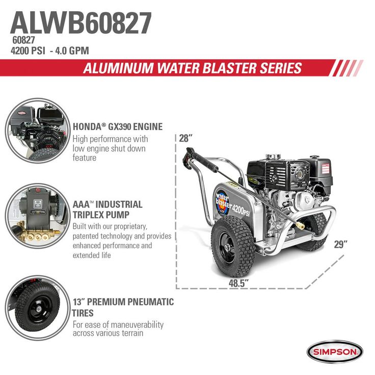 Designed to meet the rigorous demands of the cleaning professional, the SIMPSON Aluminum Water Blaster series frame is crafted of aircraft grade aluminum, making it lighter in weight than most steel frame pressure washer designs. Perfect for contractors who specialize in deck cleaning, wood restoration, paint preparation, graffiti removal and all other professional cleaning services. The SIMPSON Aluminum Water Blaster series designed for optimum performance in the harshest environments.