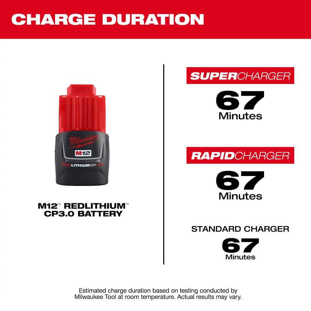 The Milwaukee M12 REDLITHIUM CP3.0 compact battery delivers up to 3X more runtime and 20% more power than standard lithium-ion packs. Built with REDLINK Intelligence and robust pack construction, it runs cooler, performs below 0°F, and fits all M12 tools while reducing weight and fatigue.