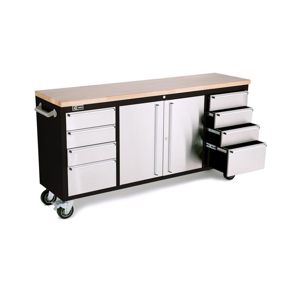 72 in. 8-Drawer Black Rolling Mobile Workbench with Stainless Steel Face