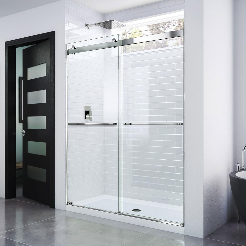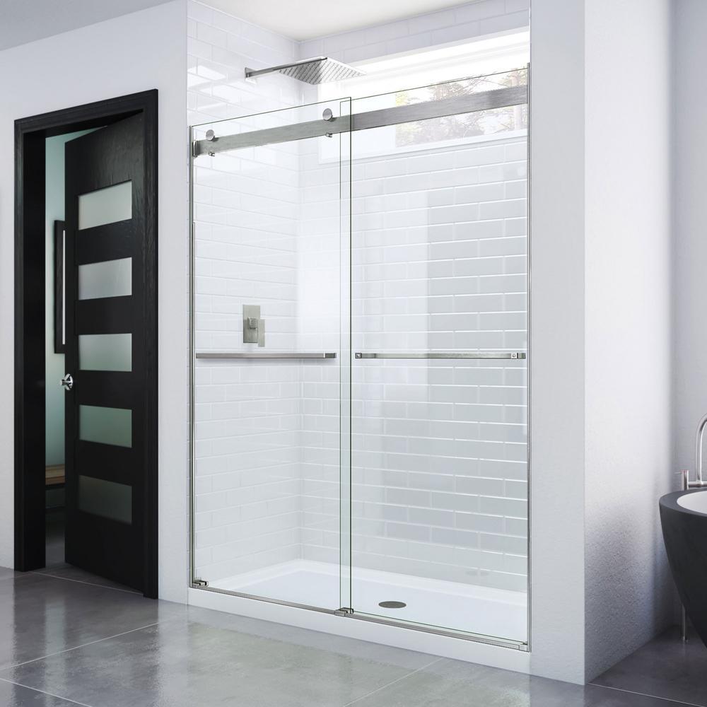The DreamLine Essence is a modern bypass shower door with dual sliding glass panels for entry from either side. Its 5/16 in. clear tempered glass features ClearMax protective coating, smooth rollers, and adjustable guiderails for a precise fit in openings 44–48 inches wide.