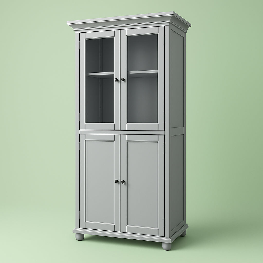 The Hampton Harbor Linen Cabinet combines elegant design with practical storage solutions. Featuring a dove grey finish, chrome hardware, and a mix of glass and solid doors, it offers versatile storage for any room. Perfect for organizing linens, dishes, or decorative items.