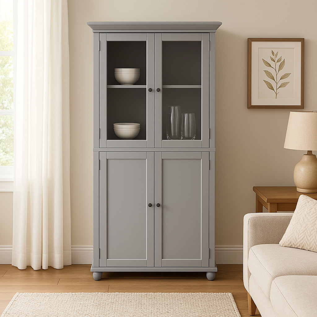 Transform your bathroom or living space with the Hampton Harbor Linen Cabinet, a masterpiece of functional elegance. Its dove grey finish and chrome accents exude sophistication, while the combination of glass and solid doors offers both display and concealed storage options. Style it with plush towels and decorative accents to create a serene and organized environment. This cabinet is not just storage—it's a statement of refined living.