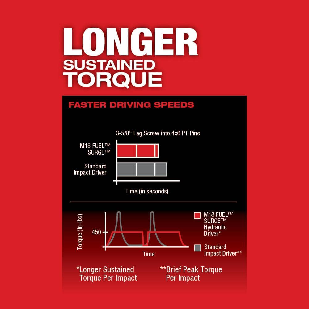 This Milwaukee M18 FUEL SURGE impact driver uses a FLUID-DRIVE hydraulic powertrain for quieter, smoother fastening. The brushless POWERSTATE motor delivers up to 3,000 RPM and 450 in-lbs of sustained torque, with 4-mode DRIVE CONTROL for precision. Compatible with all M18 REDLITHIUM batteries (sold separately).