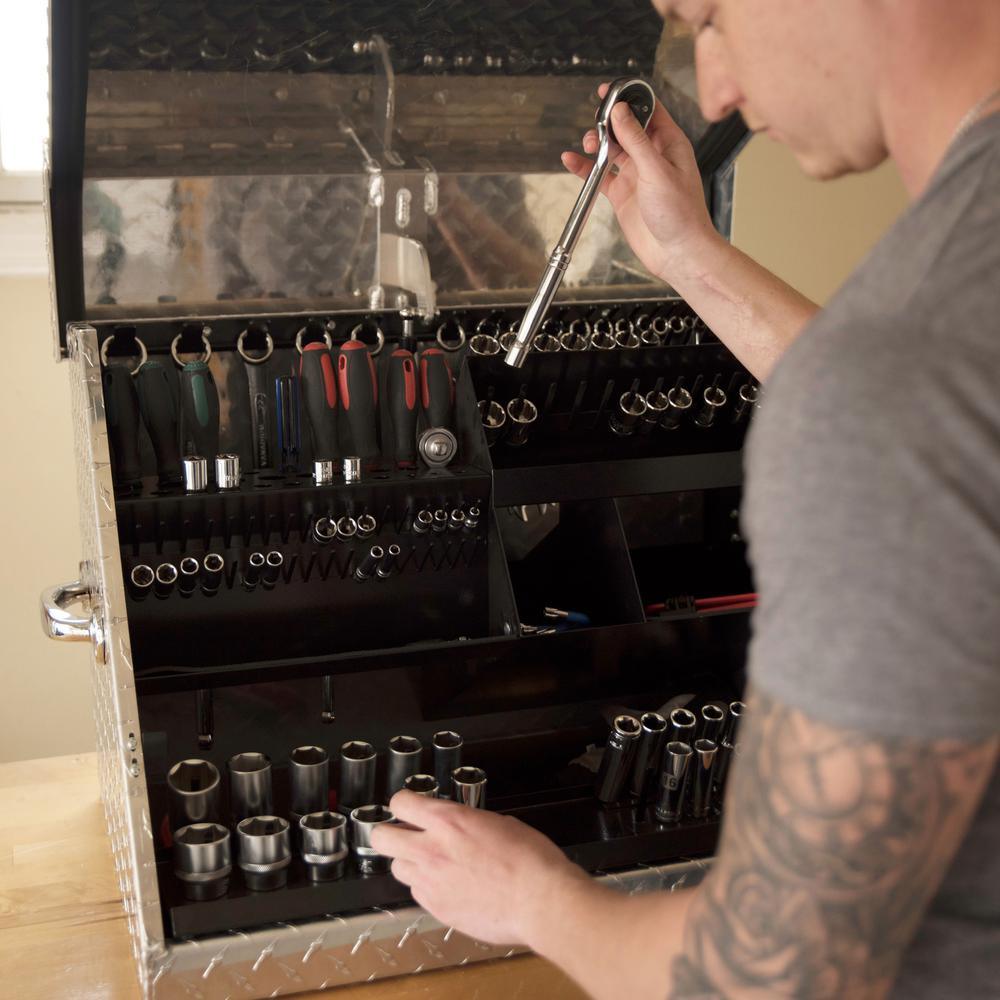 Portable Toolbox by Montezuma heavy-duty tread brite aluminum construction with welded seams, no spot welding, offers the best in rugged tool storage. Double side handles allow an easy transition from stationary to mobile as the lid secures tools in position when closed. Designated spaces for both metric and SAE tools, this box offers the best in storage for home and professional environments.