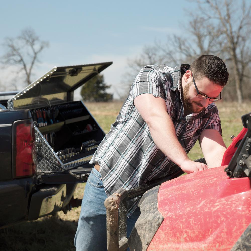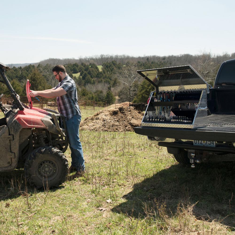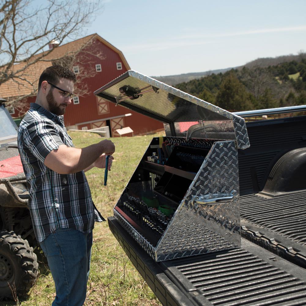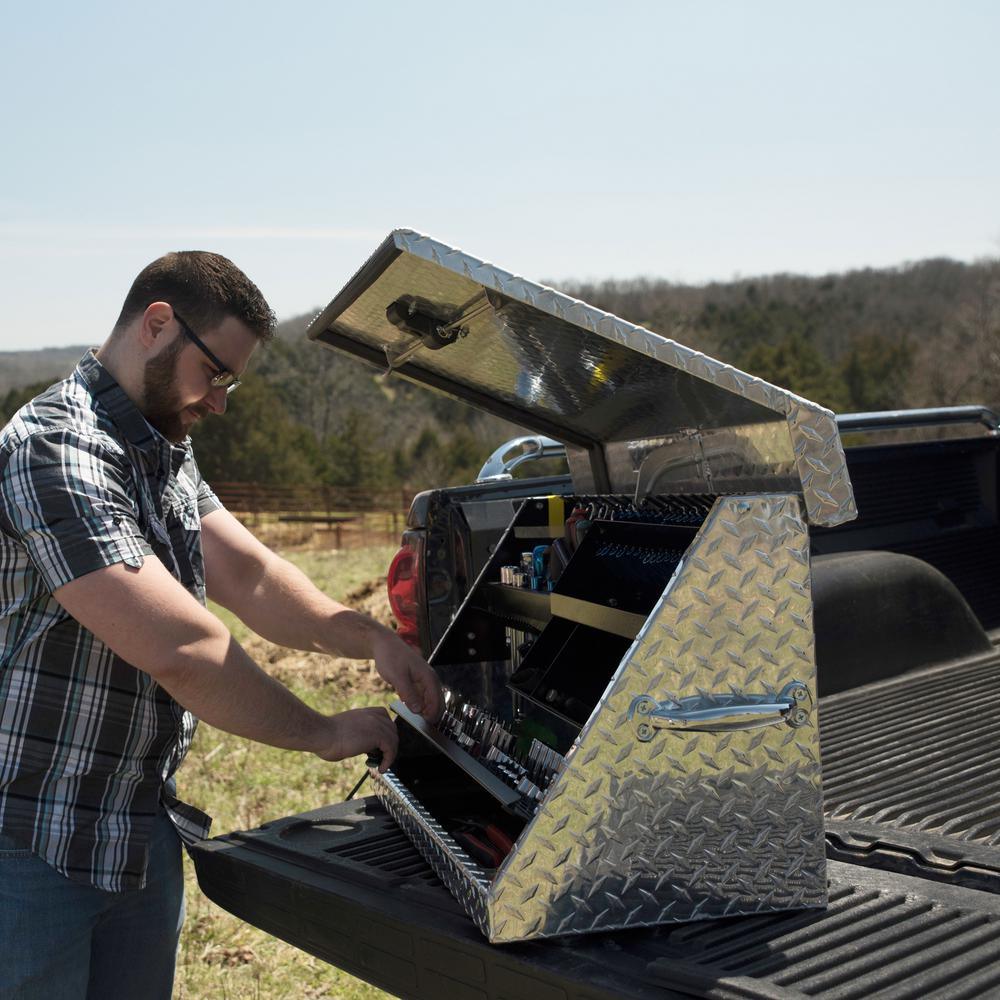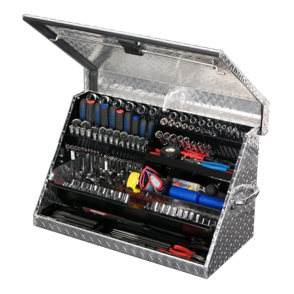 Portable Toolbox by Montezuma heavy-duty tread brite aluminum construction with welded seams, no spot welding, offers the best in rugged tool storage. Double side handles allow an easy transition from stationary to mobile, the lid secures tools in position when closed. Designated spaces for both metric and SAE tools, socket tray lifts to access tools underneath. This box offers the best in storage for home and professional environments.
