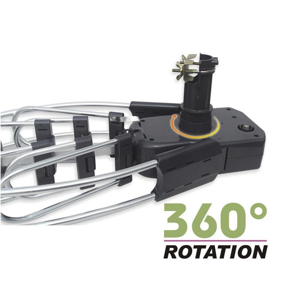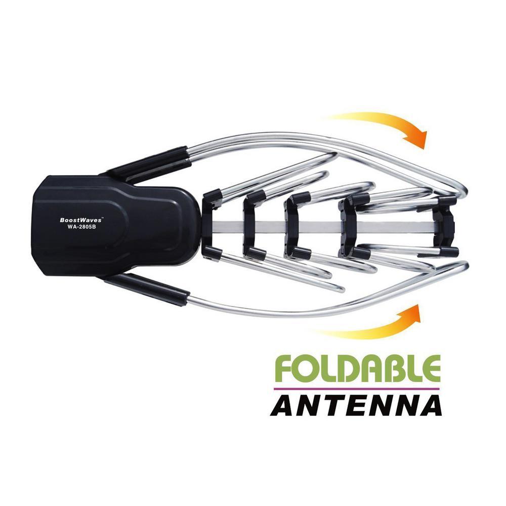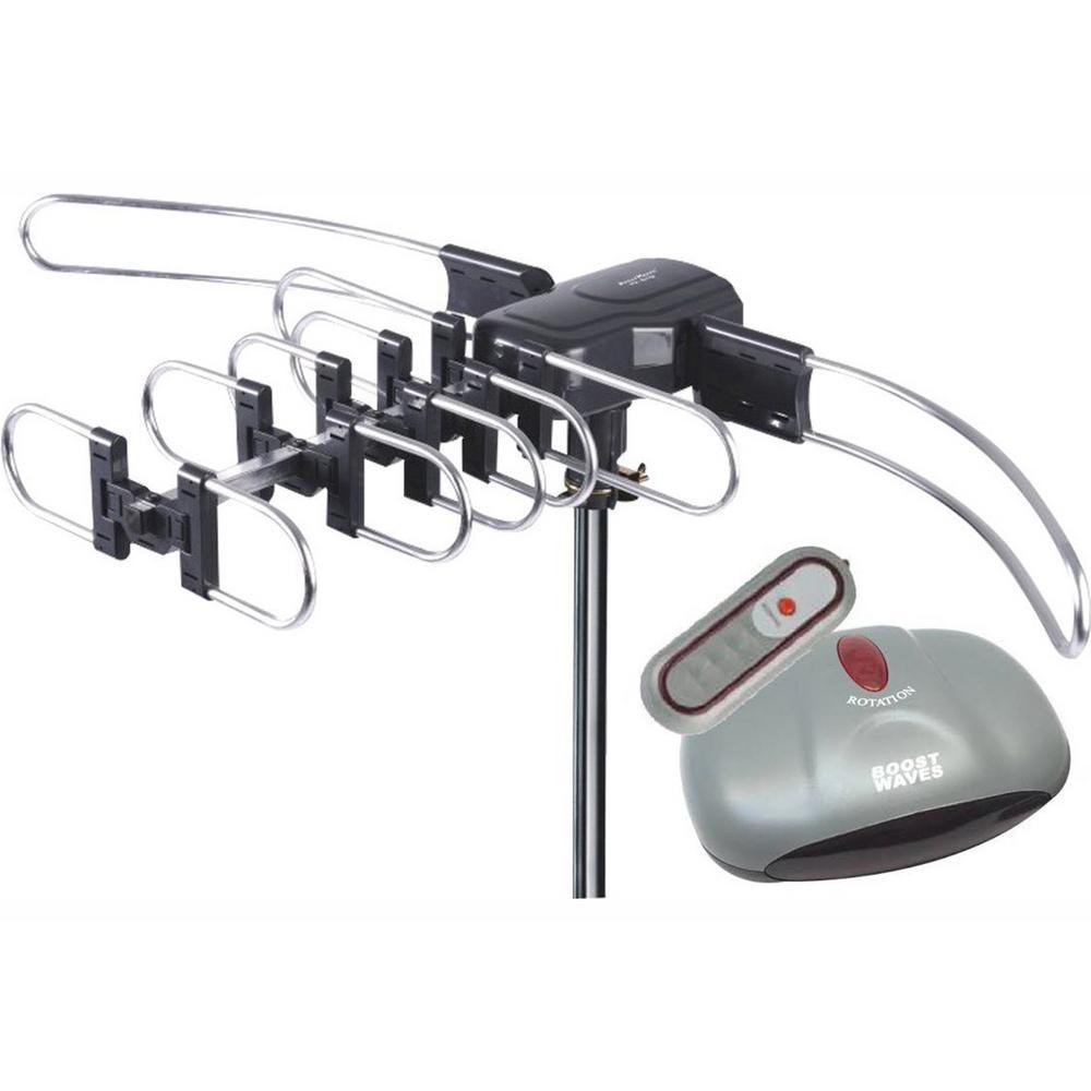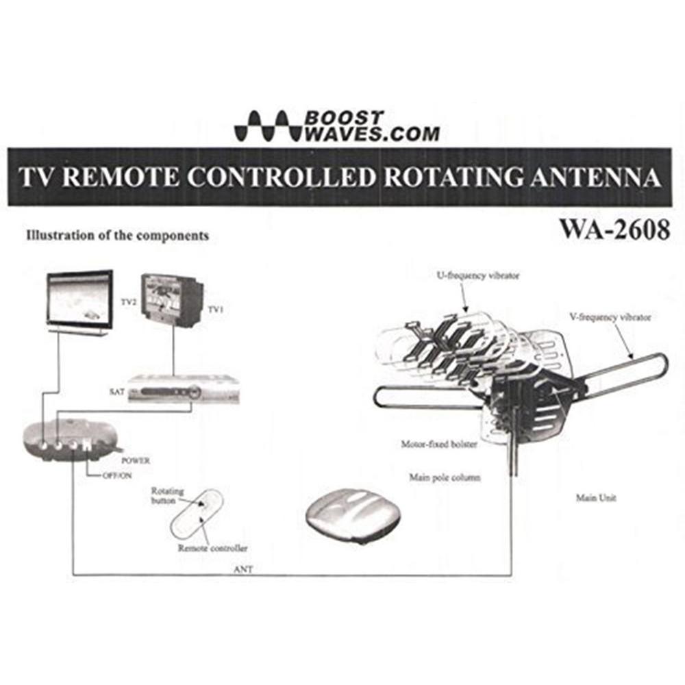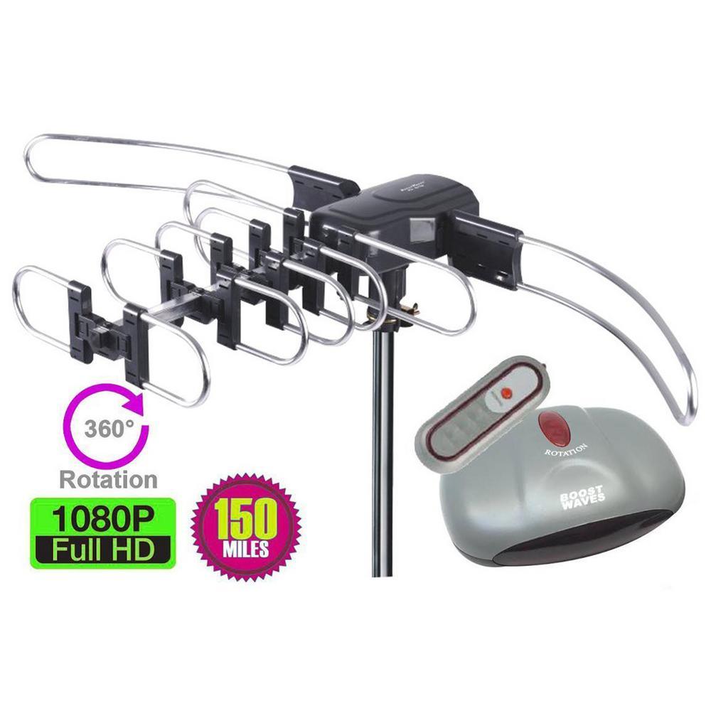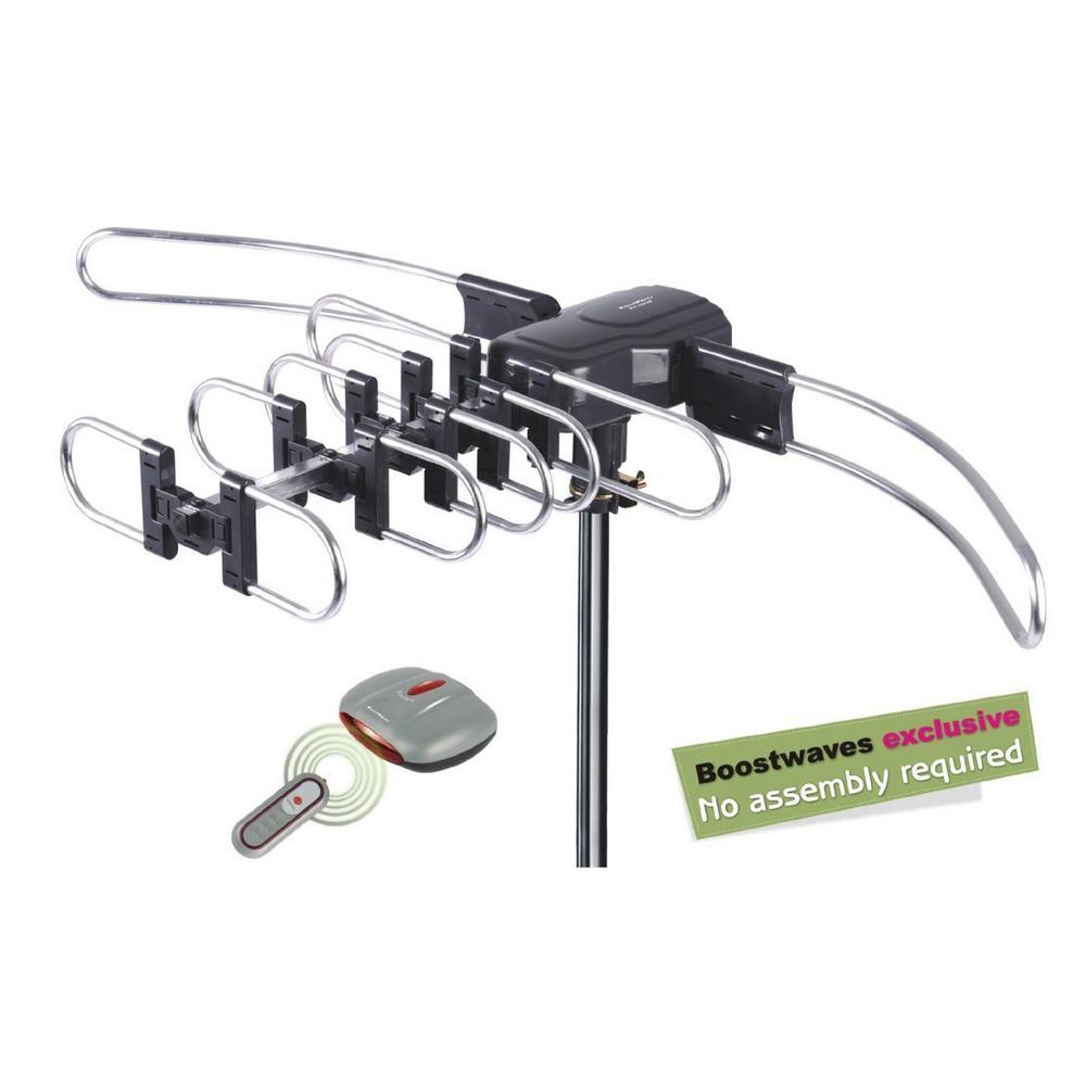 It maintains the robust design and superior quality while minimizing the hassle of assembly, the foldable design enables it be portable. This Antenna comes with our PureVertex technology, meaning that signals from other appliances, cellular signals, FM signals get omitted. Leaving you with a crisp picture and more channels. Built in Noise Reducer, which cancels noise that can be generated from household appliances, power lines and other antennas around you. This allows you to get reception of signals with low levels enabling you to view more channels. Gone are the days where you have to get up on the roof and change the direction of the antenna yourself, you can do all of that by the comfort of your living room by the touch of a button. Comes with 1 Year warranty. Specification Frequency(VHF): 40 300MHz Frequency(UHF): 470 890MHz VHF Gain: 25+/-5dB UHF Gain: 30+/-5dB Impedance: 75Ohms F-Connector Max. Rotation: Max 360 Power: 3-Watt Noise Figure: 2.5dB Voltage Input AC120-Volt +/-10%/60Hz Voltage Output: AC15-Volt/300mA Our Antennas are made from thicker aluminum and get much better reception than the competition so Boost your Signal with BoostWaves. Actual range may vary and is highly dependent on your location. Addresses in valleys or areas with large obstructions such as mountains, buildings, etc. will reduce effective range. You can search your zip on the FCC website for channels available Mounting pole not included - Put B017JFM7WW into Amazon search box for pole.
