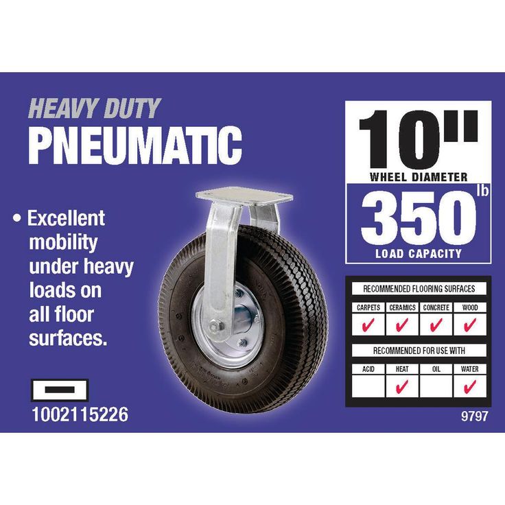 The Shepherd 10 in. Pneumatic Wheel Rigid Plate Casters give mobility to heavy loads on smooth, hard surfaces and concrete floors with obstructions. Recommended for the protection of both loads and floor surface. Caster can also be used for outdoor terrain. Wheel absorbs shock and vibration. The load rating is 350 lbs.