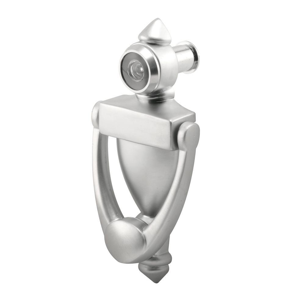 Deluxe door knocker with viewer. Features a satin nickel finish. Offers a 180° view.