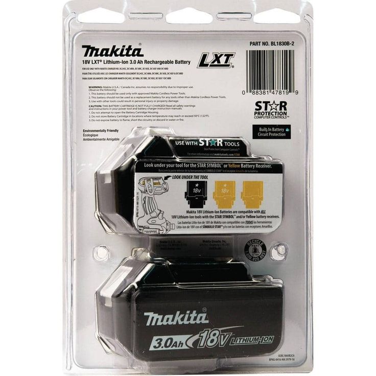 Makita 18-Volt LXT Lithium-Ion batteries charge faster and work longer than standard lithium-ion batteries, giving you and your Makita cordless tools unmatched performance and productivity for demanding applications. The Makita 3.0Ah battery (BL1830B) has a category-leading charge time of only 30 minutes, so it spends more time working and less time sitting on the charger. It also features an LED charge level indicator to monitor battery charge. Makita is the innovation leader in cordless tool technology and has the world's cordless tool line-up powered by 18-Volt lithium-ion slide-style batteries. The BL1830B is compatible only with Star Protection tools, indicated by the Star Symbol and or Yellow Battery Receiver under the tool. Makita 18-Volt Lithium-Ion batteries resist self-discharge so they're ready for use even after long periods of storage. The Rapid Optimum Charger (sold separately) is a smart-charging system that communicates with the battery during charging to monitor current, voltage and temperature. This helps optimize battery life and deliver a faster charge. The Charger has a built-in fan to cool the battery for faster and more efficient charging. For improved tool performance and extended battery life, Makita created STAR Protection Computer Controls. STAR Protection is communication technology that allows the tool and battery to exchange data in real time and monitor conditions during use to protect against overloading, over-discharging and overheating.