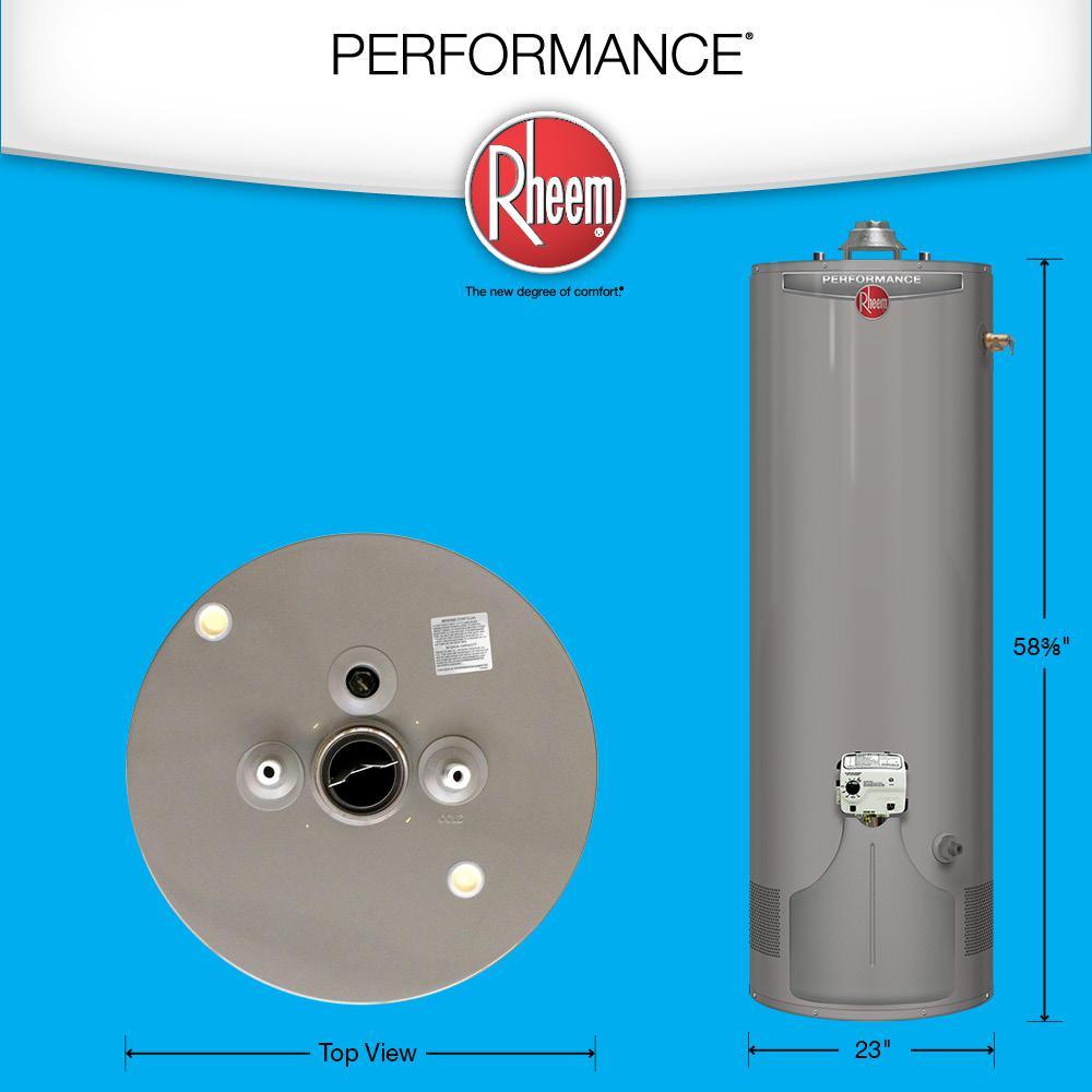 The Rheem Performance 50 Gal. Natural Gas Ultra-Low NOx Water Heater does not require an electrical outlet, features push-button ignition for match-free start up and it provides more hot water and energy cost savings, making it perfect for the replacement of an existing water heater. Provides ample amount of hot water for households with 3 to 5 people. Plus, it includes a 1-year in-home labor warranty in addition to a 6-year tank and parts warranty. Enjoy peace-of-mind with a reliable hot water solution from Rheem.
