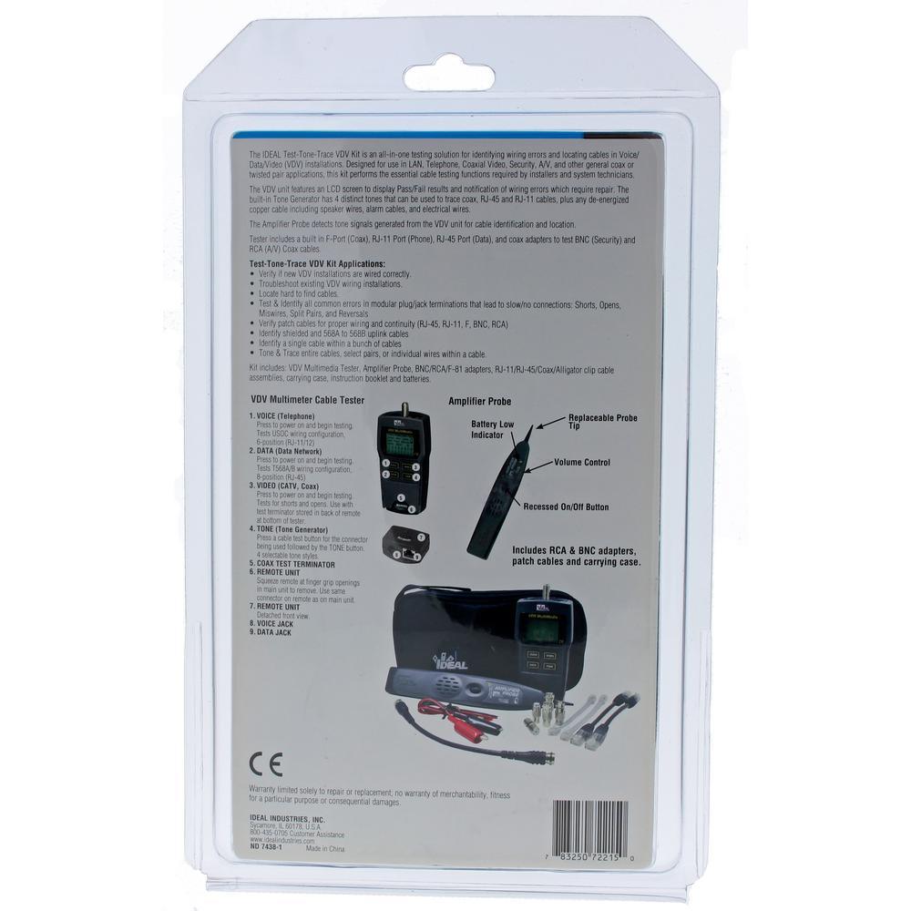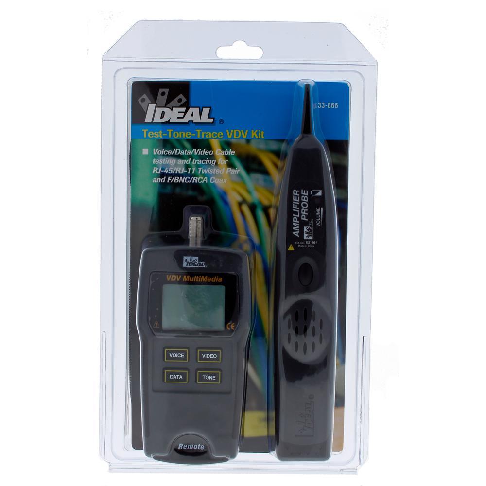 The 33-866 Test-Tone-Trace VDV kit combines two of our most popular testers - our 33-856 VDV Multimedia tester and the 62-164 Amplifier Probe plus several accessories in one kit designed to handle all of the basic testing and toning applications used by low voltage, video and data communications installers. This is an affordable kit that any installer of twisted pair or coax cable would use every day on the job. The VDV is an LCD based all-in-one basic Voice-Data-Video tester for verifying proper wiring of low-voltage and data communications cables. The primary function of the VDV is the wiremap test. The wiremap test visually shows, pin by pin, whether a cable is terminated properly at both ends and if there is continuity from end to end. The VDV can test Data/Ethernet RJ-45 (8P8C), Voice/Phone RJ-11/12(6P6C/6P4C) and Video/coax cables. The LCD visually displays PASS or ERROR after each test to verify if the cable is terminated correctly.