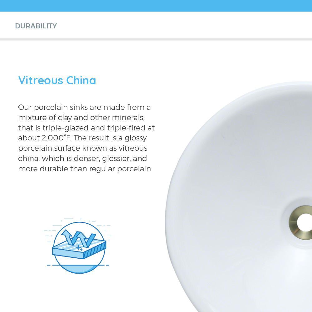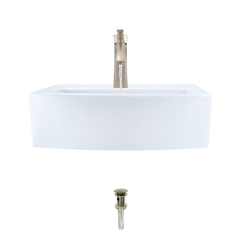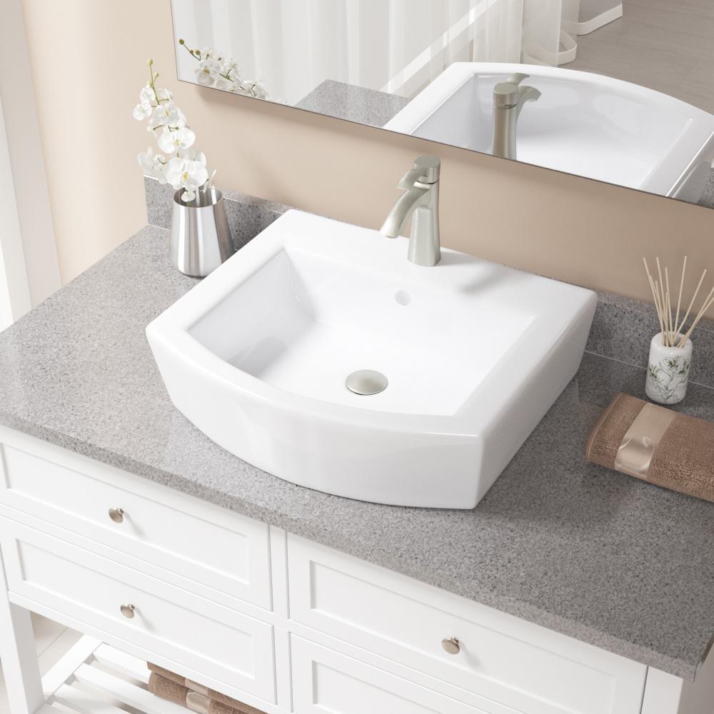 This bowed rectangular vessel features a flat platform along its back with a pre-drilled faucet hole and overflow. The additional vitreous china coating on this model creates an even more impervious and sanitary surface than standard porcelain. With an overall measurement of 22 in. x 19-5/8 in. x 6-5/8 in., it will require a minimum-width cabinet of 24 in. The 725-BN single-handle, vessel faucet is a shorter version of the 726, for use with vessel sinks which have pre-drilled faucet platforms. Standing at a 6.75 in. height with a 5 in. spout reach, its sleek lines gradually widen and contract to create a stunning design statement. The single, curved handle echoes the arch of the faucet and easily sets just the right water flow and temperature. Ceramic disc cartridges assure long-term, dependable operation, and a beautiful brushed nickel finish completes its distinctive appearance. The faucet is constructed without lead and is compliant with NSF (National Sanitation Foundation) standards, the Safe Drinking Water Act, the cUPC (Uniform Plumbing Code of the United States and Canada), the ADA (American Disabilities Act) and carries the EPAs WaterSense label. Additionally, a spring-loaded, vessel pop-up drain (vpud) is included, which opens and closes with a simple press to its attractive brushed nickel cap. Due to the design of some vessels and their open backs, faucet hardware and unfinished areas may be seen if installed directly in front of a mirrored surface.