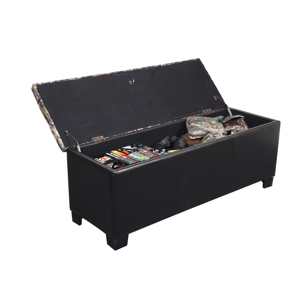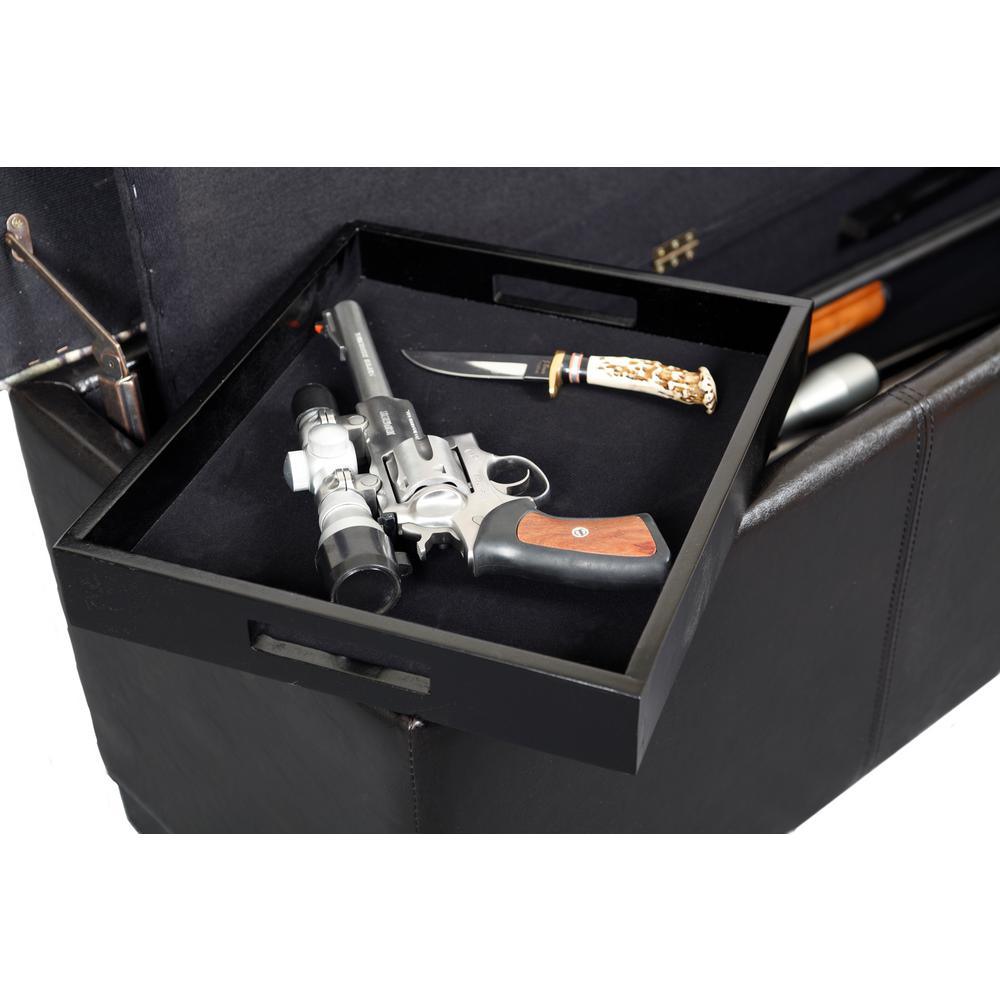 The gun concealment bench provides a clever way to store your firearms with room for up to five long guns. A removable wood tray is also provided for handguns or other accessories. This attractive brown poly-urethane bench with True Timber camo accented lid features a locking concealed gun compartment lined with soft fabric. The upper compartment provides ample room for blankets or other sportsmen accessories. Additional features include attractive hardwood feet, removable butt and barrel rests, and dual safety stays that hold the lid open preventing pinching.