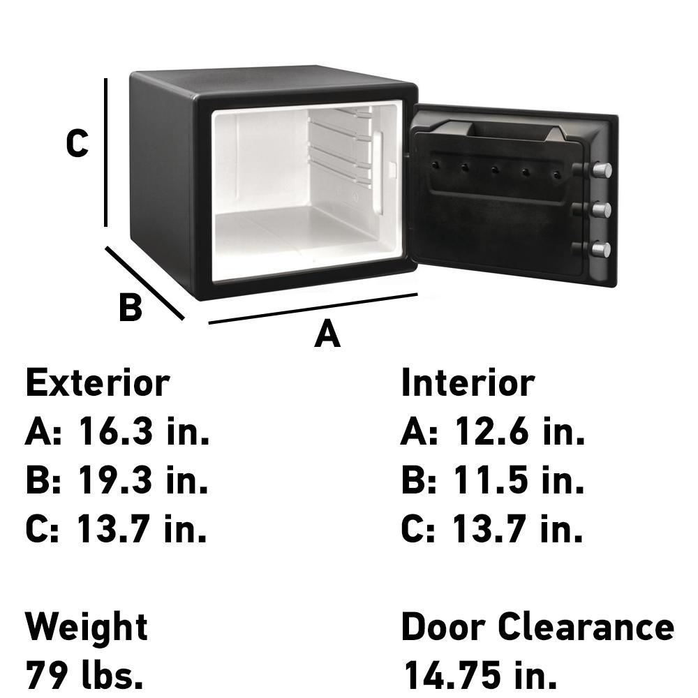Exterior: 16.3 in. W x 19.3 in. D x 13.7 in. H; door requires 14.75 in. of clearance to fully open; interior: 12.6 in. W x 11.5 in. D x 9.6 in. H; large 0.81 cubic foot capacity; weighs 79 lbs.
