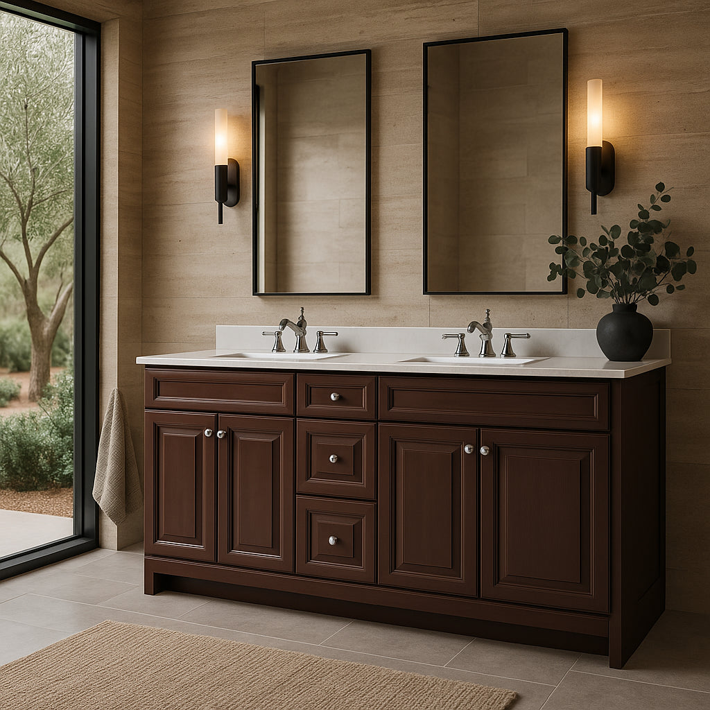 The Brinkhill 60-Inch Bathroom Vanity in Chocolate combines timeless design with practical features, including soft-close hinges, spacious storage, and durable construction.