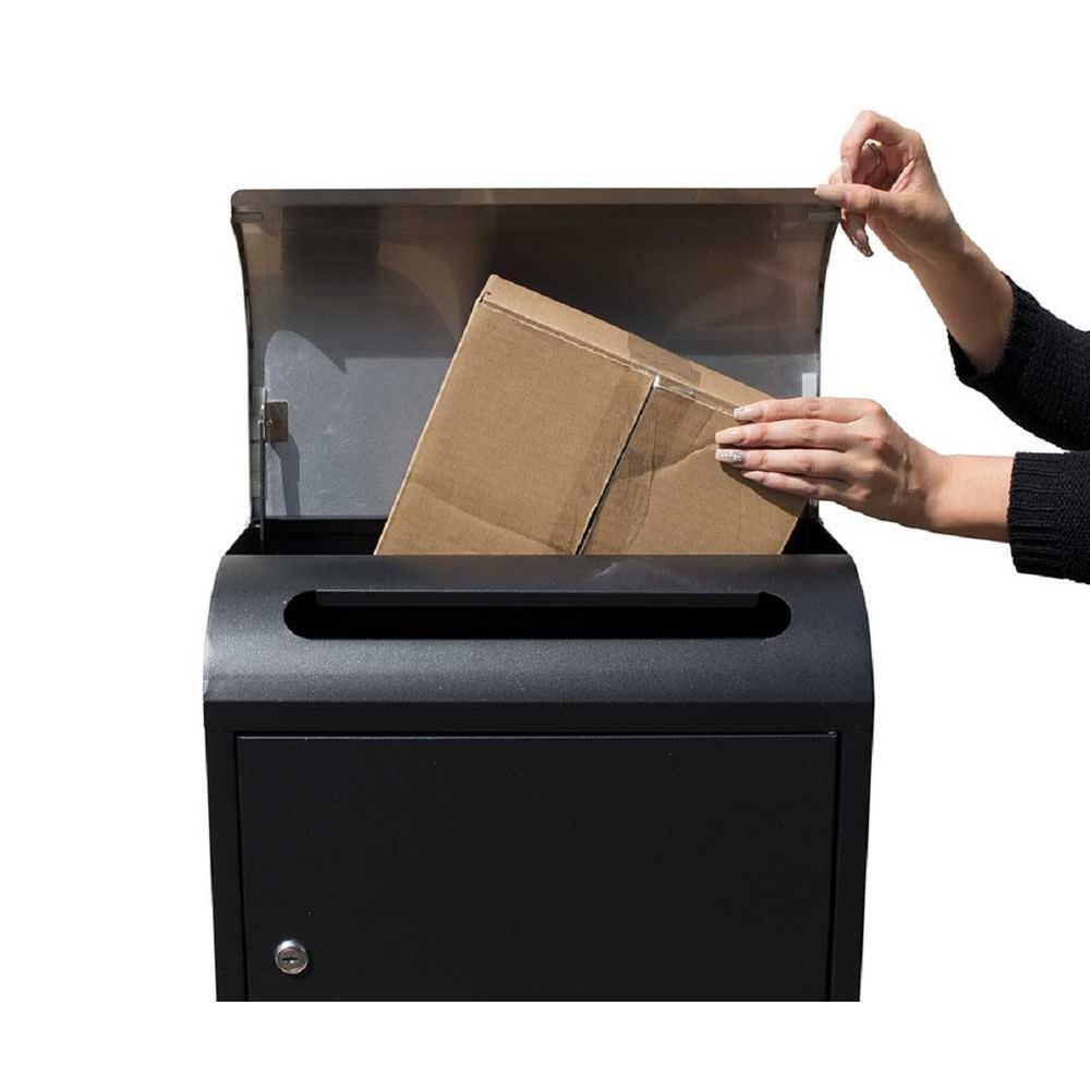 Locking retrieval door swings open in front for easy parcel/mail access