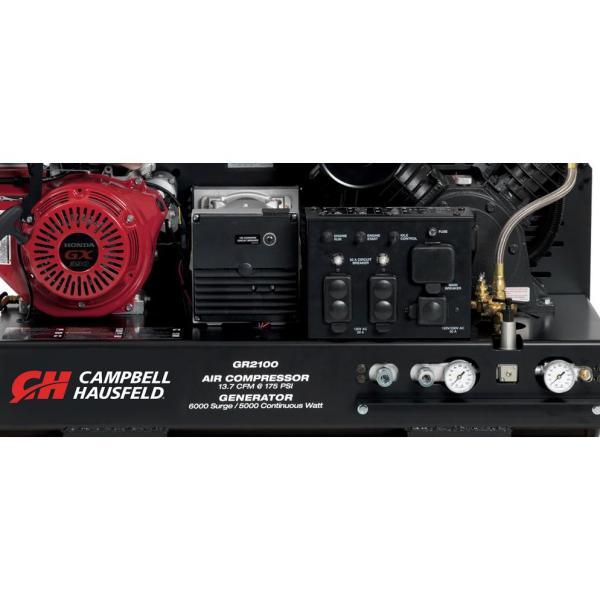 The Campbell Hausfeld 2-in-1 air compressor/generator (GR2100) is ideal for jobsites and work trucks, delivering 14 CFM of airflow at 90 PSI to drive a wide variety of air tools, plus providing up to 5,000-Watt of AC power to operate 120-Volt and 240-Volt electrical tools, lights and more. A reliable Honda GX-390 engine powers this unit, which features a 2-stage, cast-iron air compressor that's designed for high output and industrial reliability. Twin 5 Gal. air tanks deliver a total air capacity of 10 Gal. Built with safety in mind, this air compressor/generator has a control panel that's OSHA compliant certified; the electrical outlets are GFCI protected. A heavy-duty, 14-Gauge steel belt guard is securely bolted to the unit to help prevent accidents. Finish your projects faster and easier with Campbell Hausfeld - The Air Power Expert.