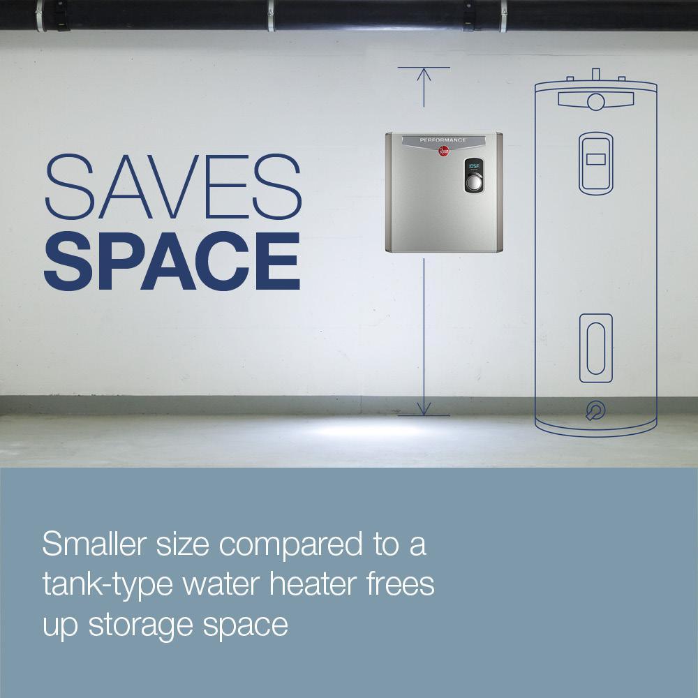 Reduce energy use and save on costs with this Rheem Performance tankless electric point-of-use water heater. Ideal for compact areas, such as under sinks, this unit provides enough hot water for up to two faucets based on geographical location (see selection guide). It saves by only heating water when needed. This water heater features an electronic temperature control that adjusts from 80 to 140 degrees F in 1-degree increments. Professional installation is recommended, as this low-maintenance tankless water heater is compatible with 1/2 in. water connectors for flex hose installation.