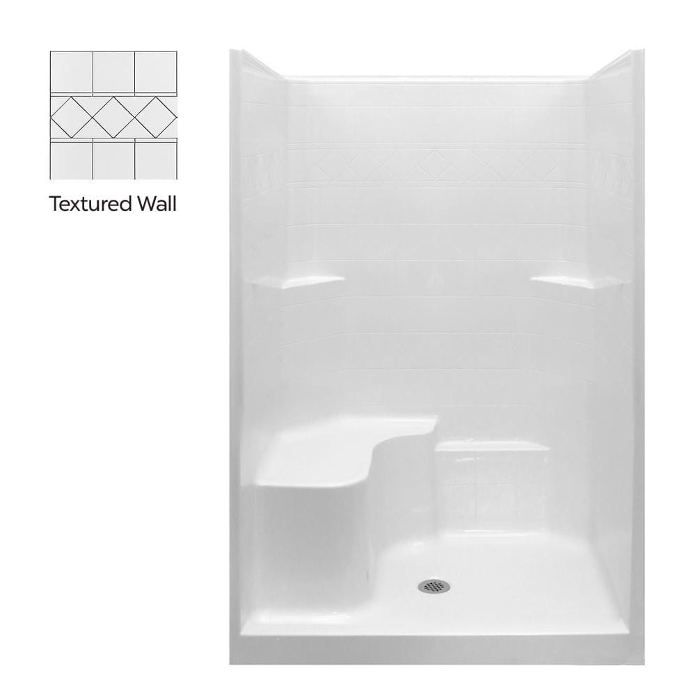 Features Built-in shower seat, shelves, slip-resistant floor, simulated tile wall pattern with diamond accent