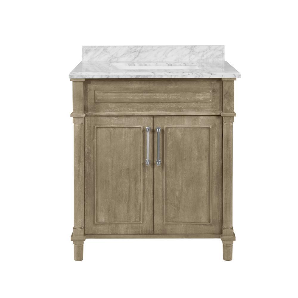 Let the Aberdeen 32 in. Corner Vanity with white marble top and backsplash add a bit of class to your bathroom decor. This modern vanity comes with a beautiful white ceramic basin and two soft closing storage cabinet doors.