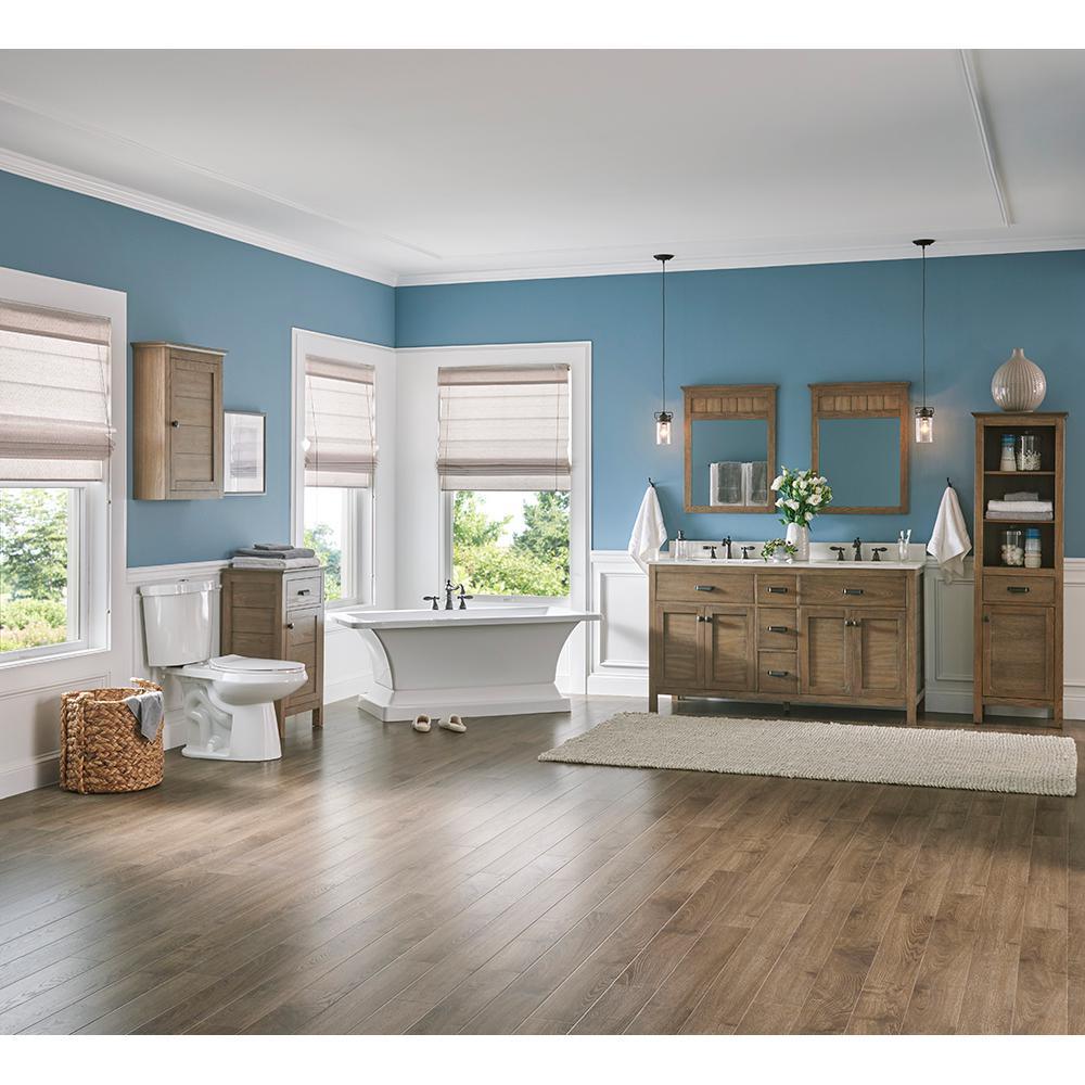 Bring rustic style into your bathroom in an updated and charming way with the Stanhope 20 in. x 68 in. Linen Cabinet. With details such as horizontal routing in the wood, reclaimed oak finish, and antique bronze knobs, style is only the beginning of the great features the Stanhope linen cabinet has to offer. Two top open adjustable shelves, one large interior cabinet with one adjustable shelf and soft close door, and one slow close drawer provide the extra storage space you've been dreaming of.
