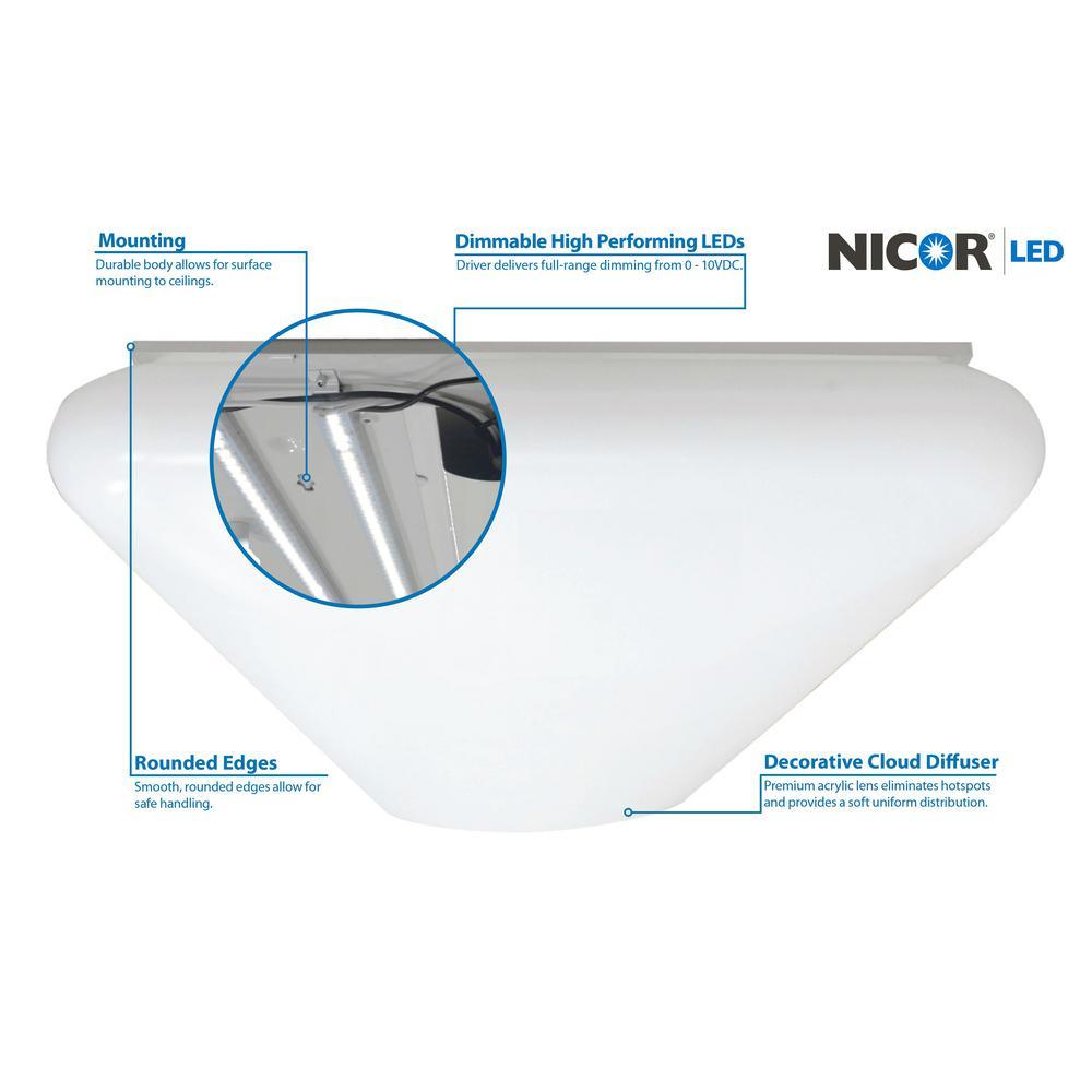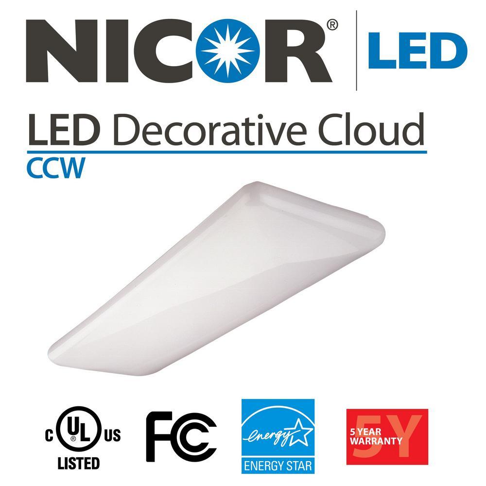 The CCW LED Decorative Cloud offers general ambient lighting for surface mount ceiling applications and is available in both standard and high output Lumen packages to allow for design flexibility. The rounded edges of the acrylic lens offer a soft aesthetic while allowing for maximum light output. The CCW is the perfect energy-saving solution for both remodel and new construction in residential and light commercial applications such as kitchens, garages, utility rooms, schools, offices and hallways.