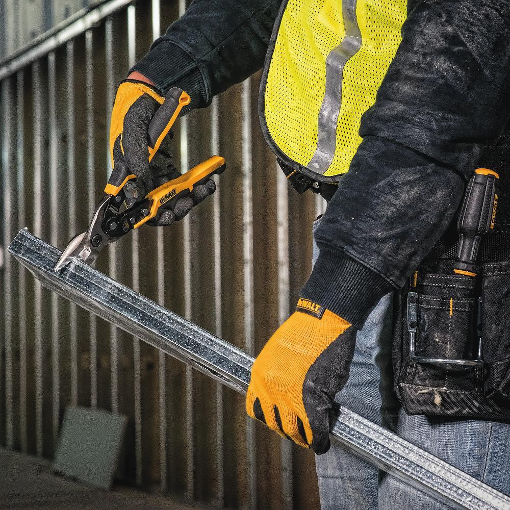 The DEWALT Ergo Aviation snip was designed with a reduced handle span, providing lower level of muscle effort required while cutting tough materials. This tool is traditionally used for cutting aluminum, vinyl siding, screening, cardboard, leather, copper and 18-Gauge to 22-Gauge sheet metal. The snip's serrated cutting edge prevent materials from slipping during use and the slip-resistant, bi-material cushion grip ensures a firm, comfortable grip.