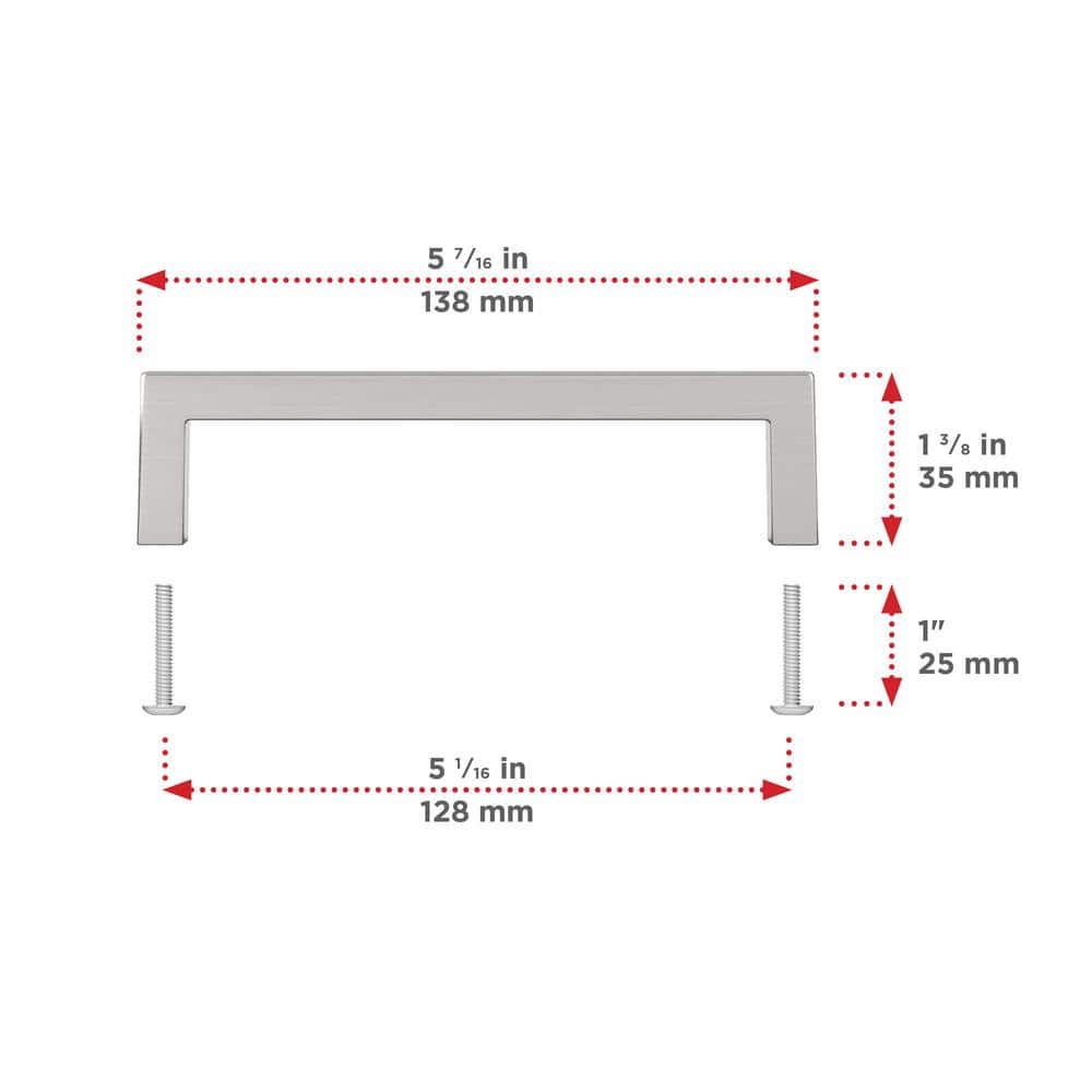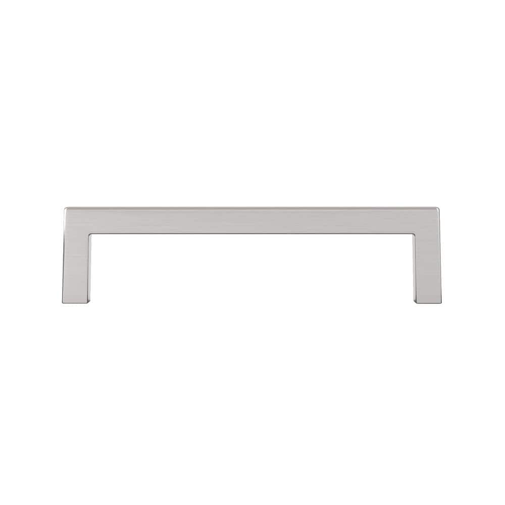 A sleek, rectangular bar pull in brushed nickel that updates cabinets and drawers with modern style. Designed with a 128 mm center-to-center fit and durable metal construction for everyday use.